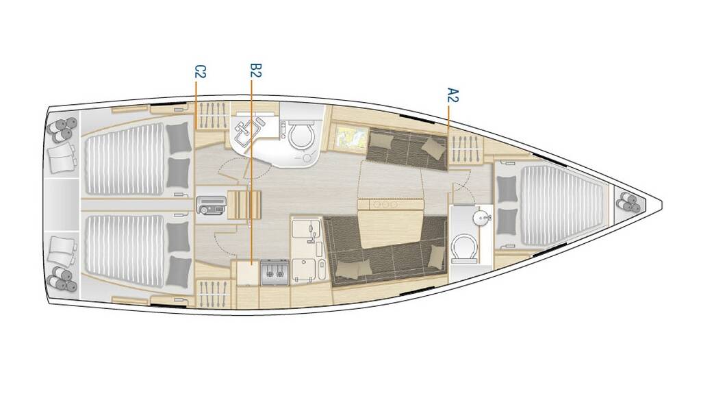 Segelyacht Hanse 388 Brukus, Baujahr 2019, liegt im Marina Kornati, Biograd, Zadar & Umgebung, Kroatien vor Anker. Es verfügt über 3 Kabinen und bietet Platz für 6 + 2 Personen mit 2 Toiletten. Bettwäsche und Küchenausstattung sind im Preis inbegriffen.