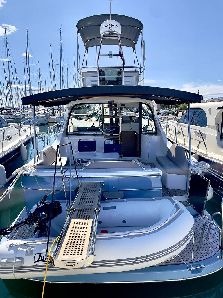 Motor yacht Adriana 44 FLY Baby Blue, built in 2024 is anchored in the Sukosan, D-Marin Dalmacija Marina, Zadar region, Croatia. It has 3 cabins, can accommodate 6 + 1 people and has 2 toilets. Bed linen and kitchen equipment are included in the price.