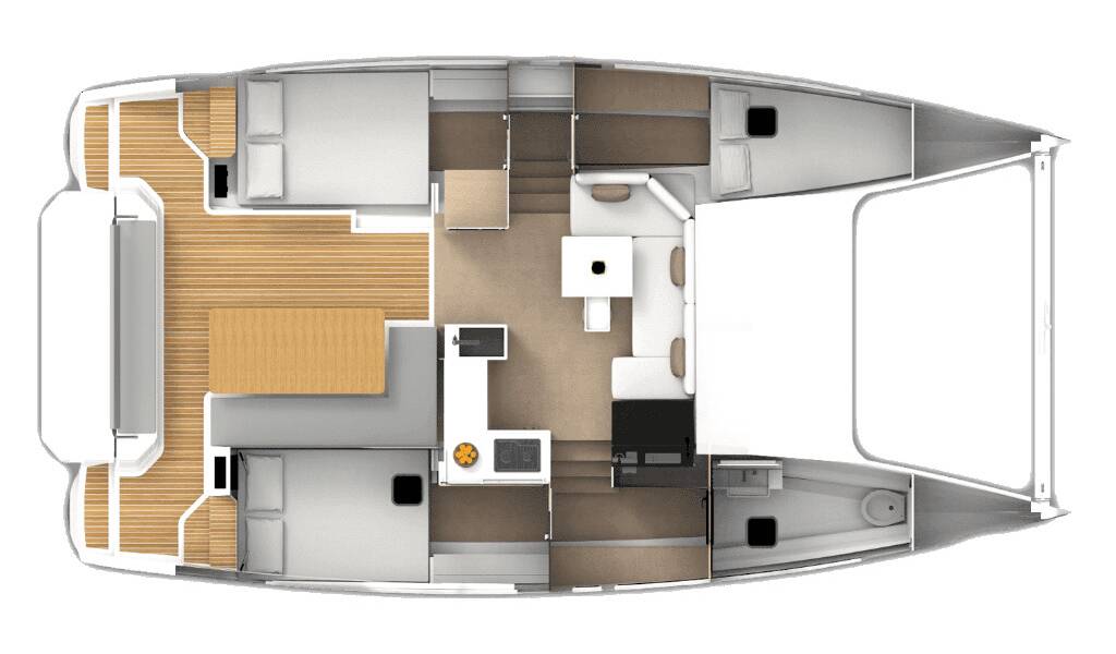 Catamaran Aventura 34 Marlon, built in 2022 is anchored in the Marina Kornati, Biograd, Zadar region, Croatia. It has 3 cabins, can accommodate 6 people and has 1 toilets. Bed linen and kitchen equipment are included in the price.