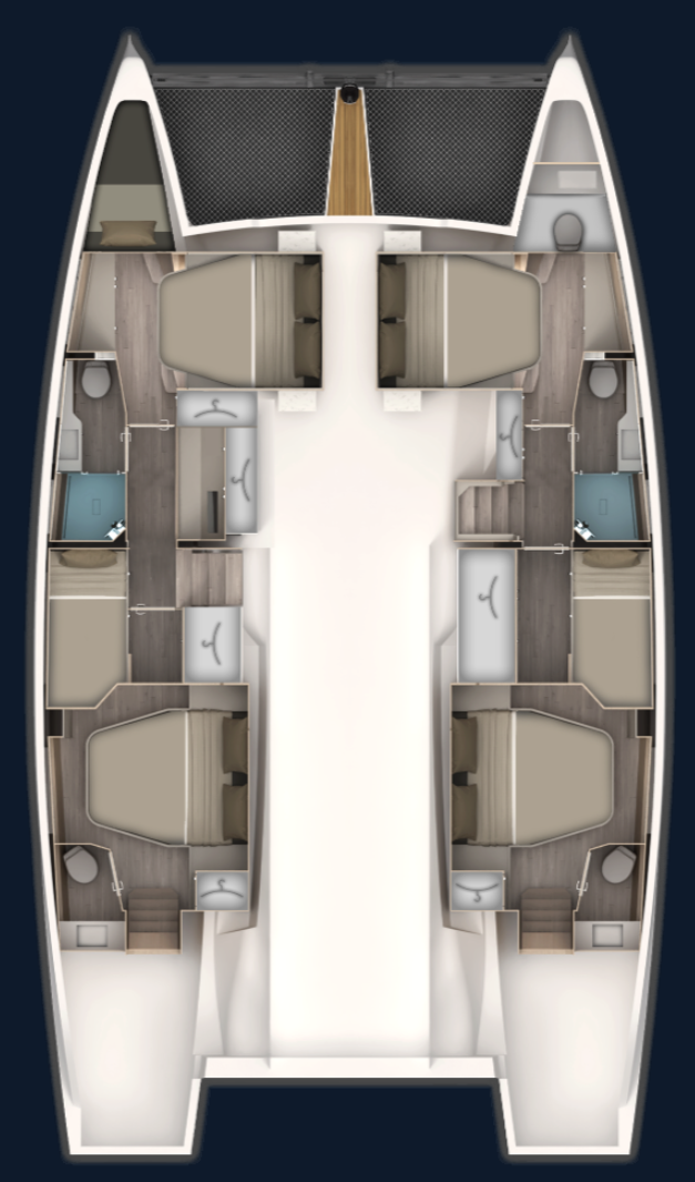 Catamaran Aventura 45 Cajha, built in 2025 is anchored in the Trogir, Yachtclub Seget (Marina Baotić), Split region, Croatia. It has 4 + 1 cabins, can accommodate 8 + 1 people and has 4 toilets. Bed linen and kitchen equipment are included in the price.