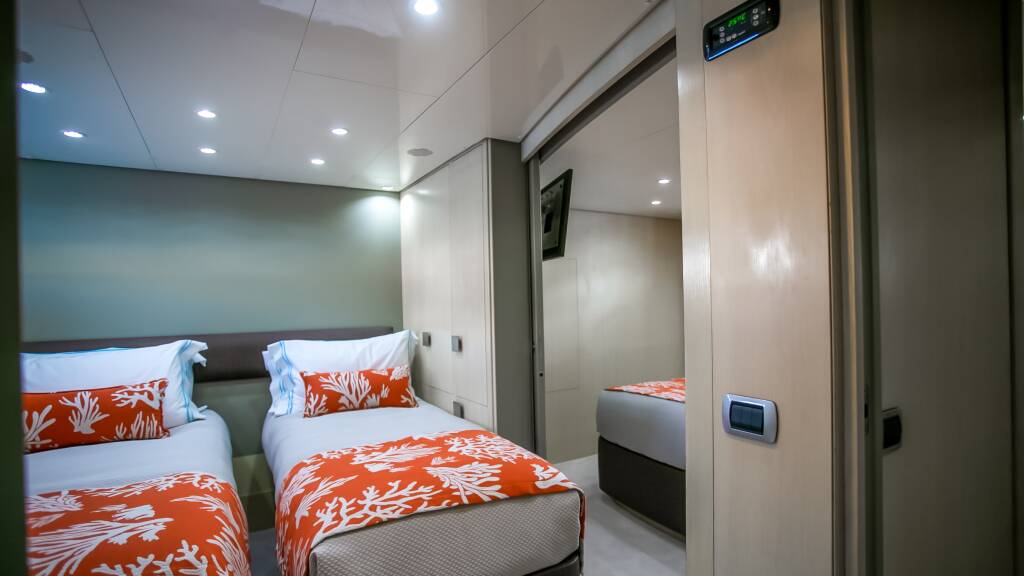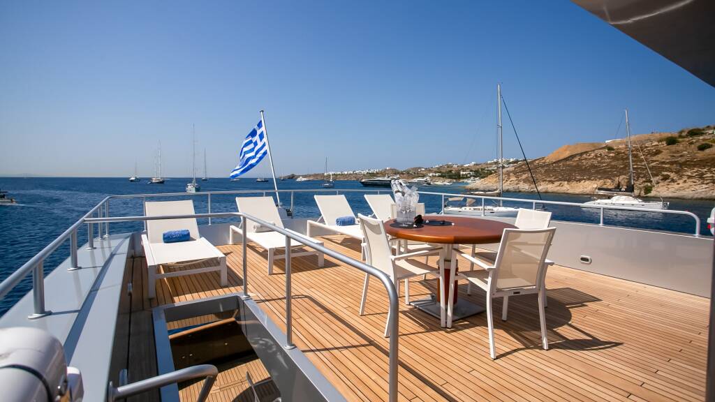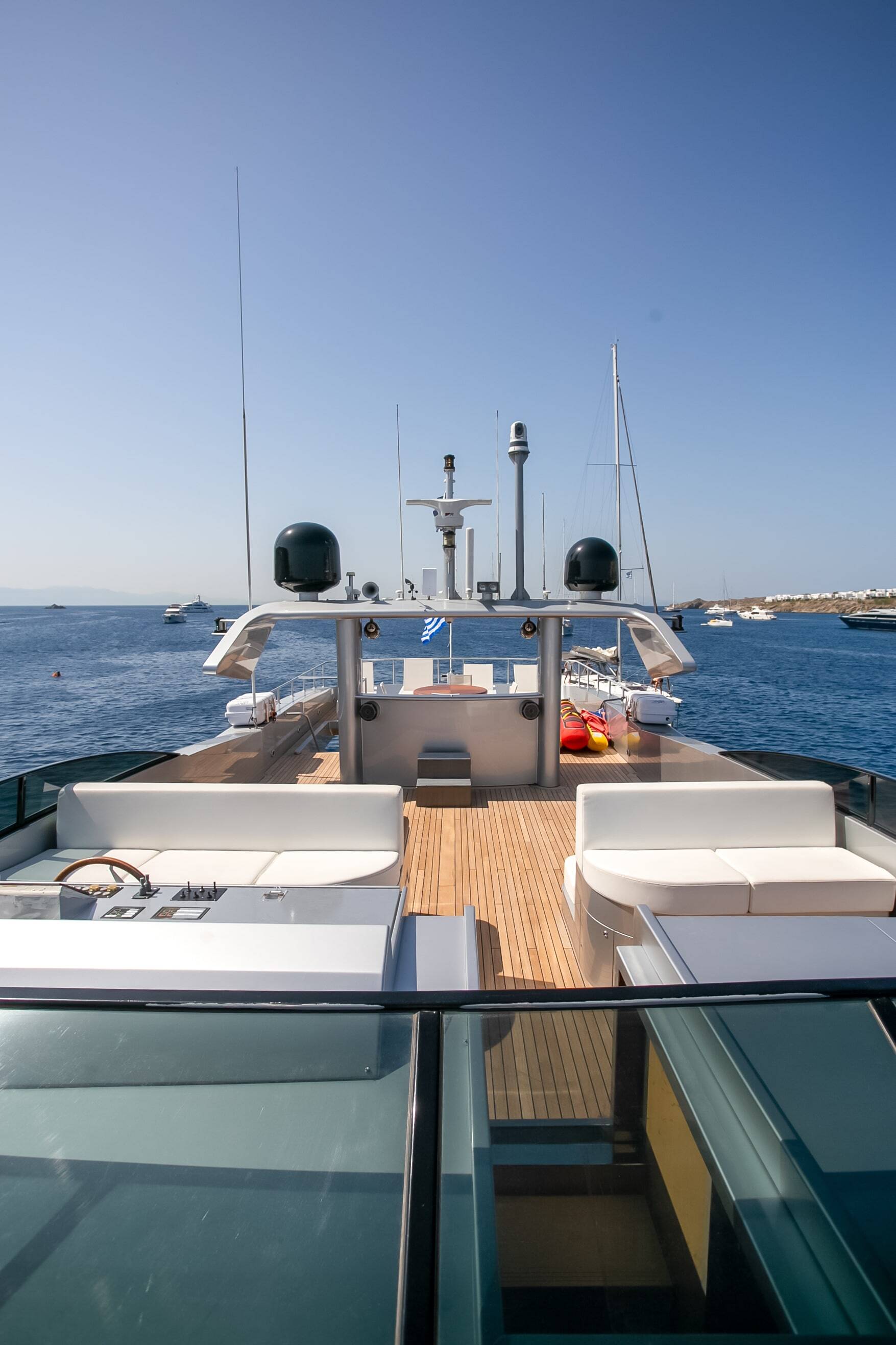 Motor yacht Baglietto 100 Sofia Y, built in 2003 is anchored in the Mykonos, Cyclades, Greece. It has 4 cabins, can accommodate 8 people and has 4 toilets. Bed linen and kitchen equipment are included in the price.