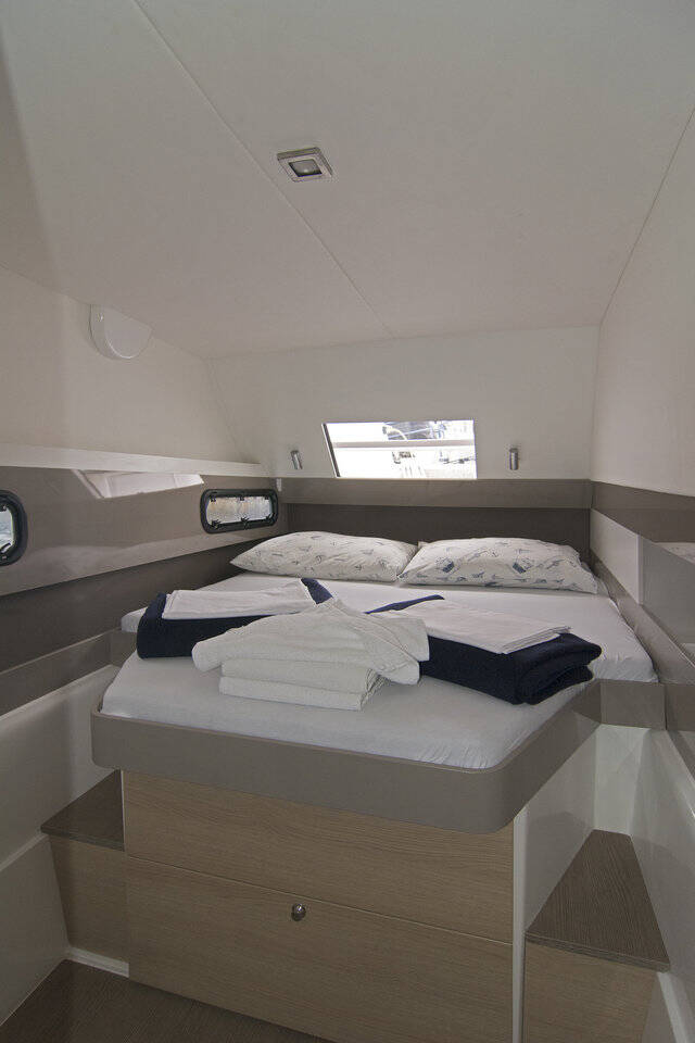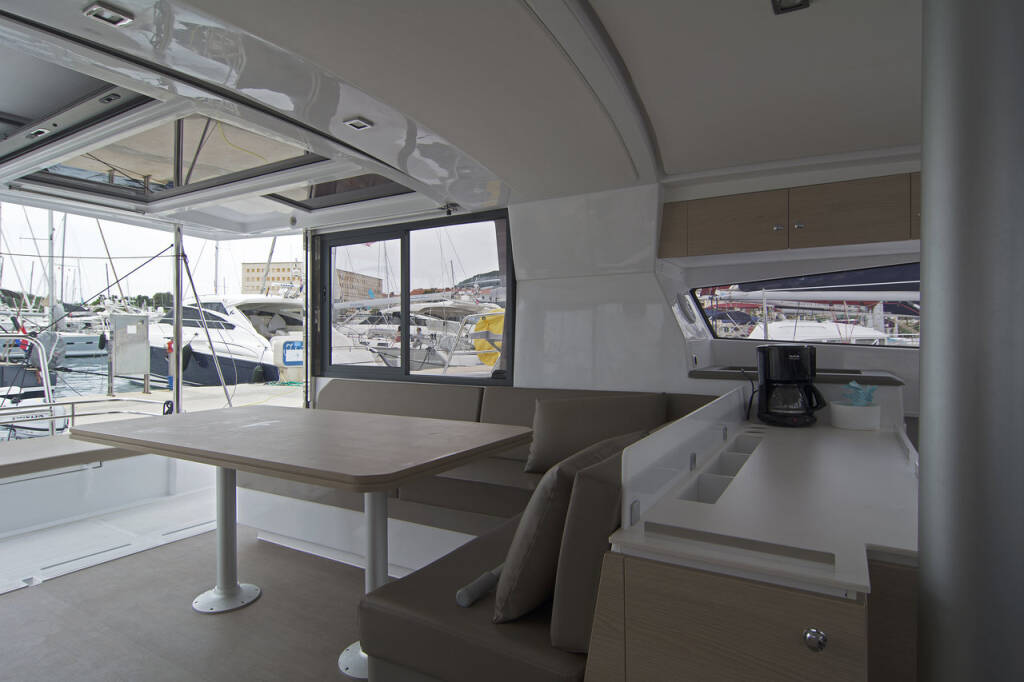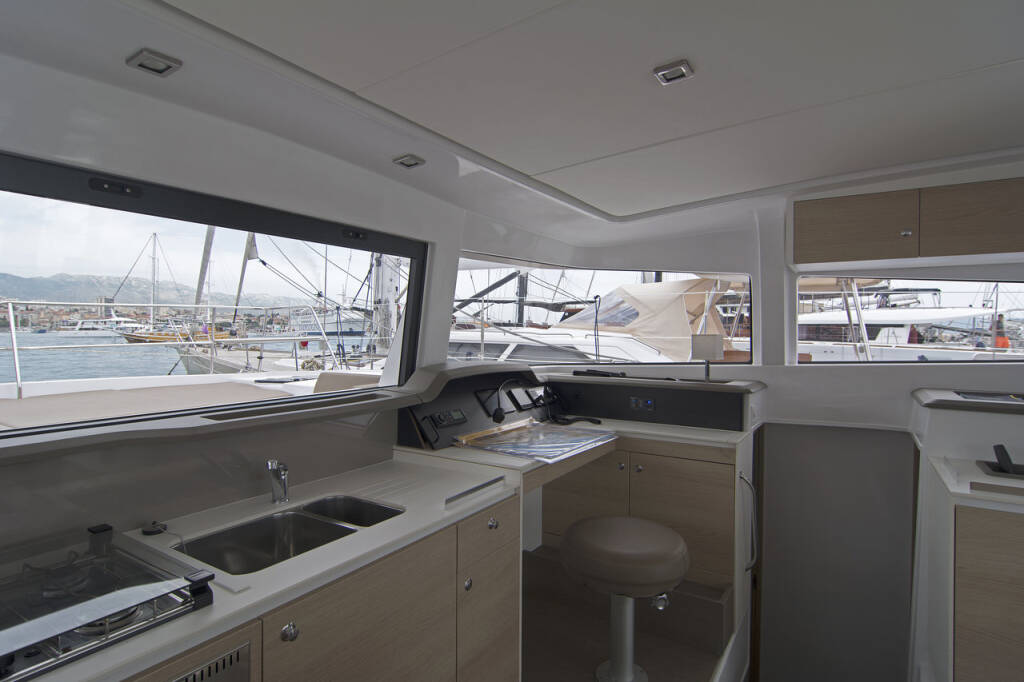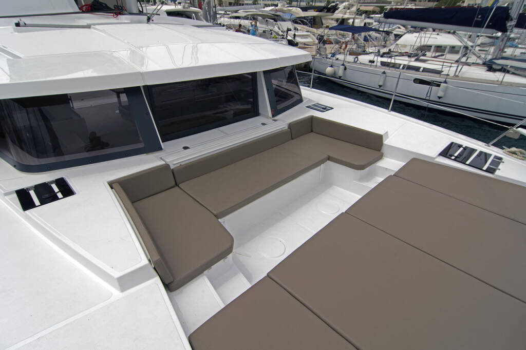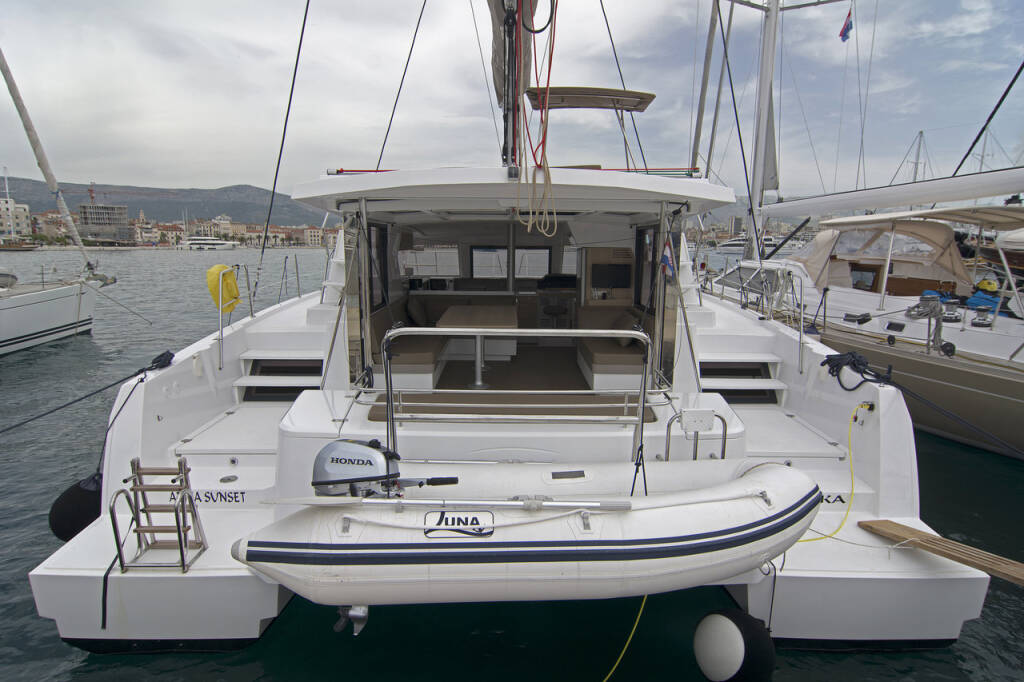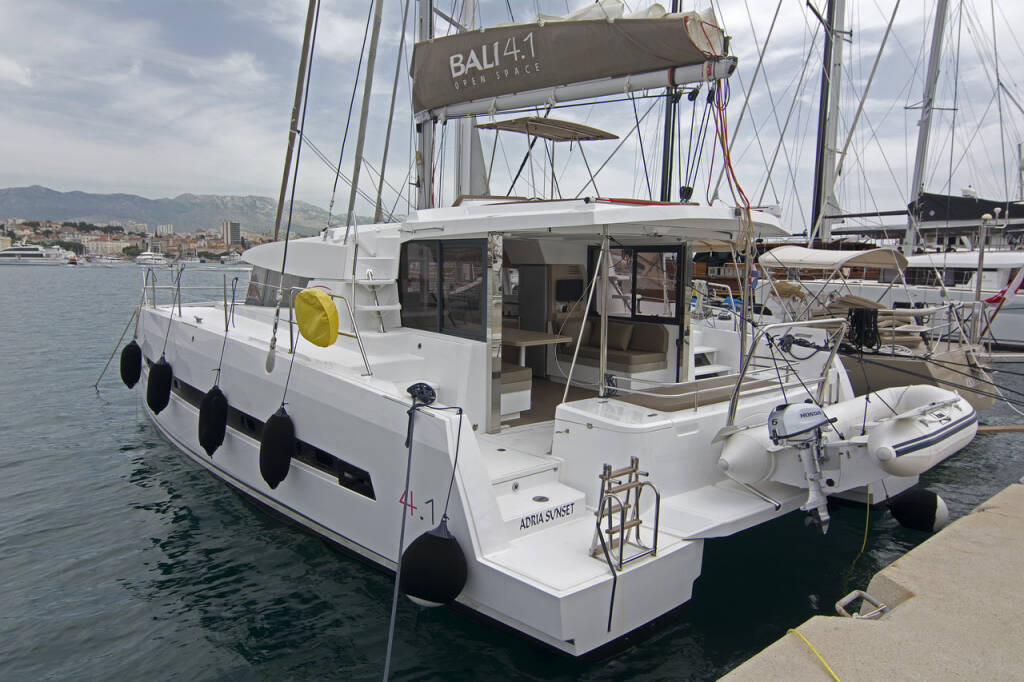 Catamaran Bali 4.1 Adria Sunset, built in 2019 is anchored in the ACI Marina Split, Split region, Croatia. It has 4 cabins, can accommodate 8 + 2 people and has 4 toilets. Bed linen and kitchen equipment are included in the price.