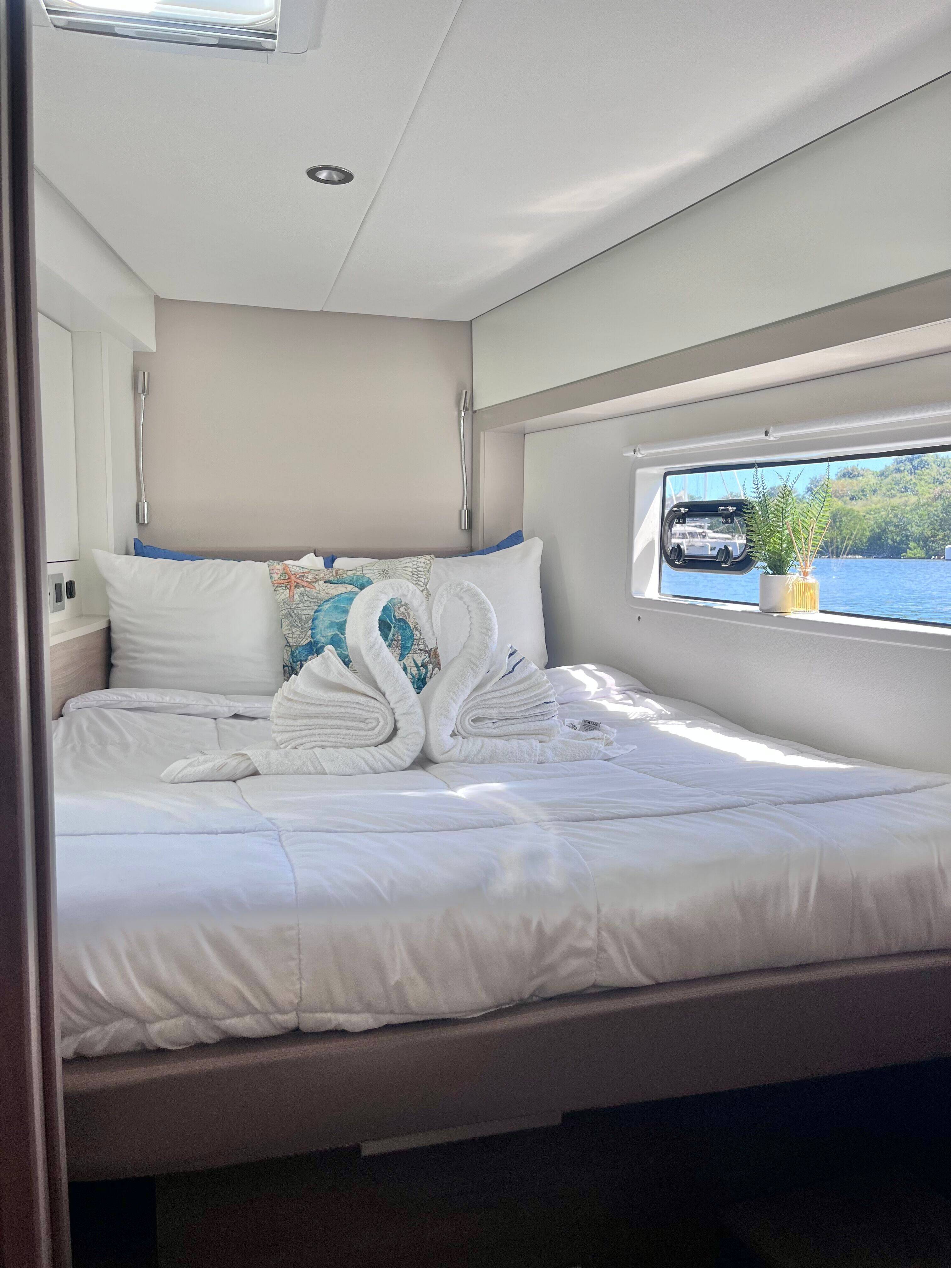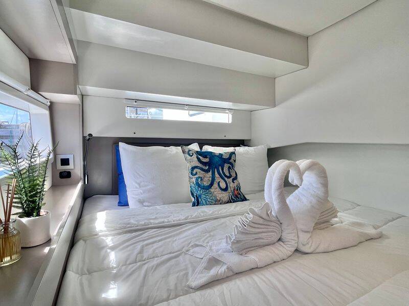 Catamaran Bali 4.2 Hard Deck, built in 2023 is anchored in the BVI, Hodge's Creek Marina, British Virgin Islands, British Virgin Islands. It has 4 cabins, can accommodate 8 people and has 4 toilets. Bed linen and kitchen equipment are included in the price.