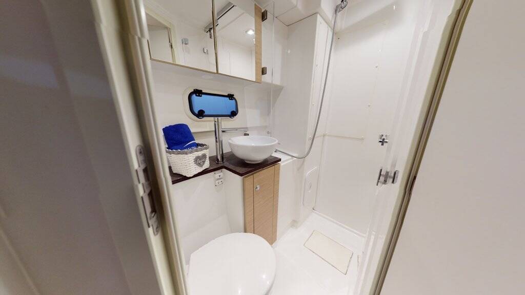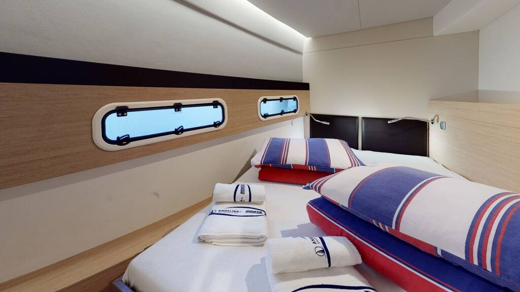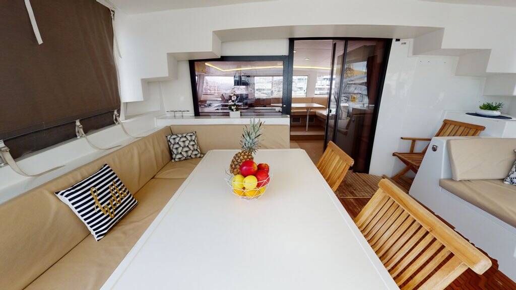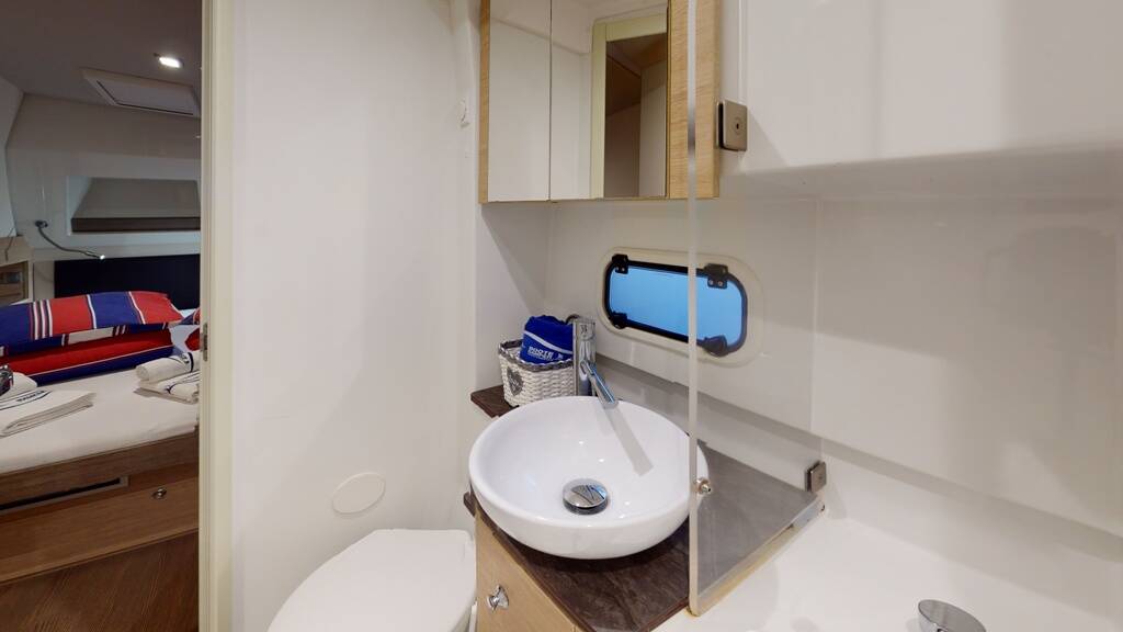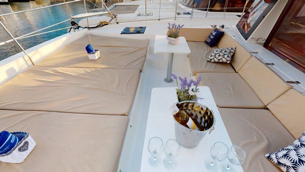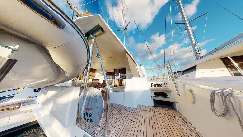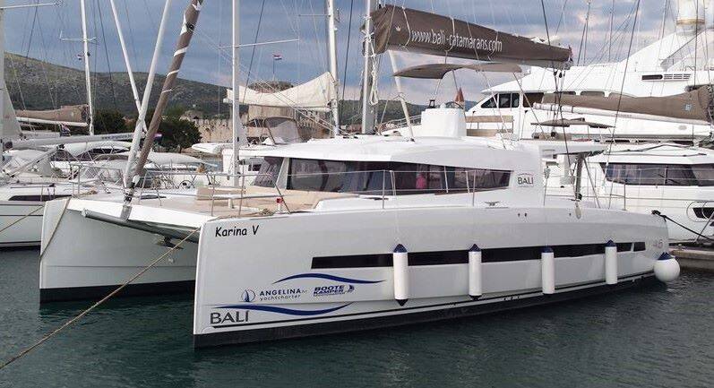 Catamaran Bali 4.5 Karina V, built in 2017 is anchored in the Trogir, Marina Trogir (ex.SCT), Split region, Croatia. It has 4 + 2 cabins, can accommodate 8 + 2 people and has 4 toilets. Bed linen and kitchen equipment are included in the price.