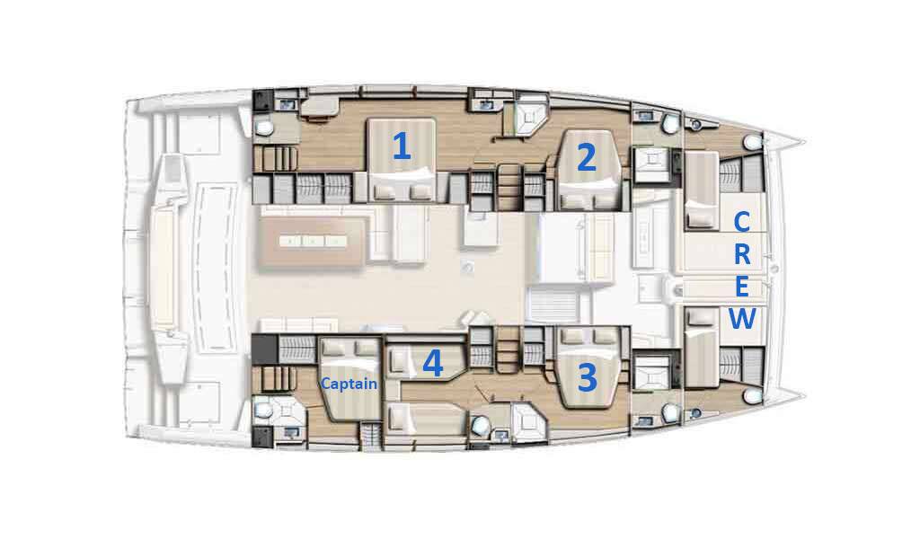 Catamaran Bali 5.4 Elena, built in 2020 is anchored in the Capo D'orlando Marina, Sicily, Italy. It has 4 + 3 cabins, can accommodate 8 people and has 4 + 3 toilets. Bed linen and kitchen equipment are included in the price.