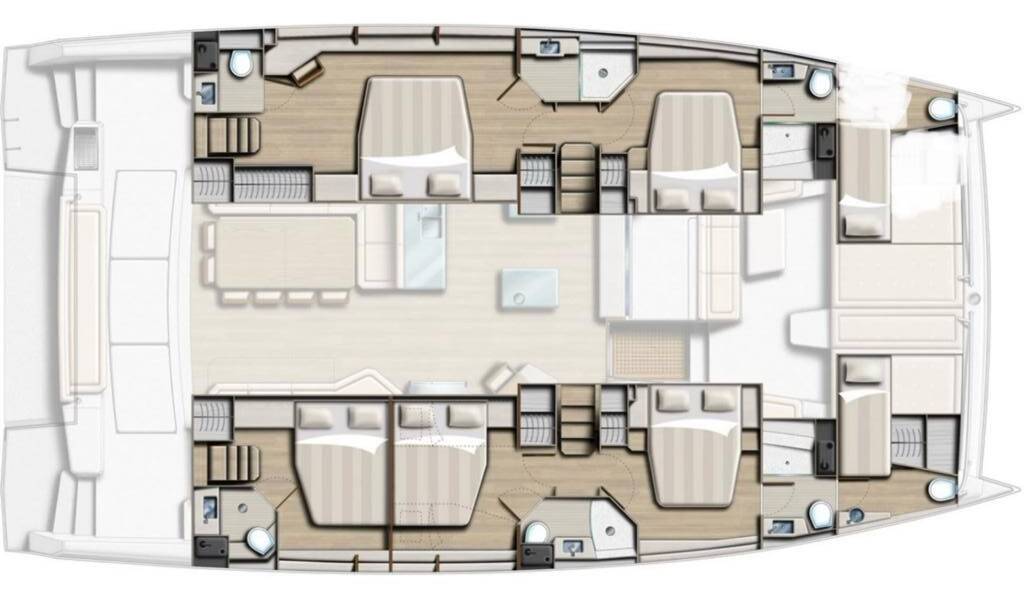 Catamaran Bali 5.4 Joža, built in 2023 is anchored in the Trogir, Marina Trogir (ex.SCT), Split region, Croatia. It has 5 + 2 cabins, can accommodate 10 + 2 people and has 5 + 1 toilets. Bed linen and kitchen equipment are included in the price.
