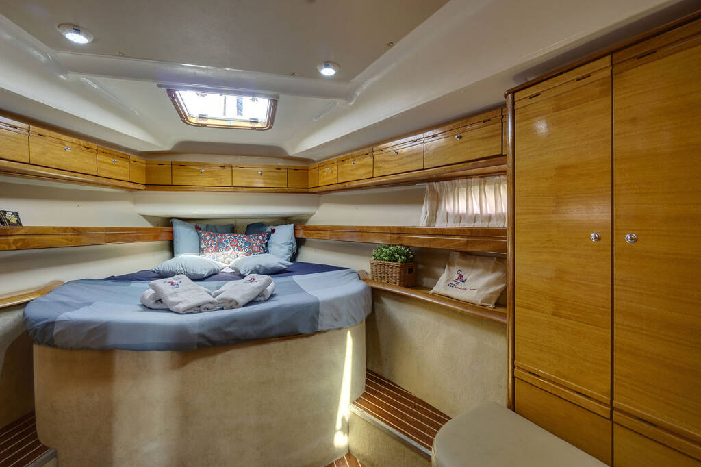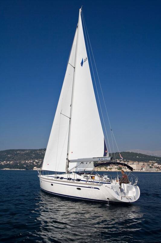 Sailing yacht Bavaria 46 Cruiser La Louna, built in 2008 is anchored in the Lefkas main port, Ionian Islands, Greece. It has 4 cabins, can accommodate 8 people and has 2 toilets. Bed linen and kitchen equipment are included in the price.