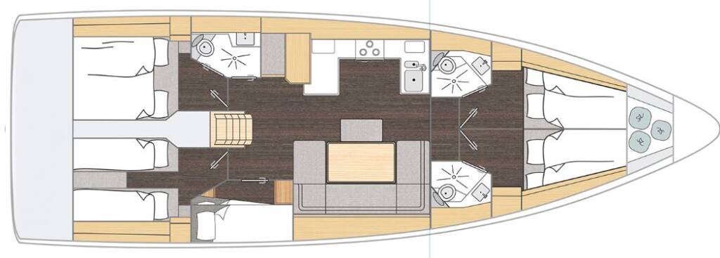 Sailing yacht Bavaria C46 Kebifaiv, built in 2024 is anchored in the Palairos, Ionian Islands, Greece. It has 5 cabins, can accommodate 10 people and has 3 toilets. Bed linen and kitchen equipment are included in the price.