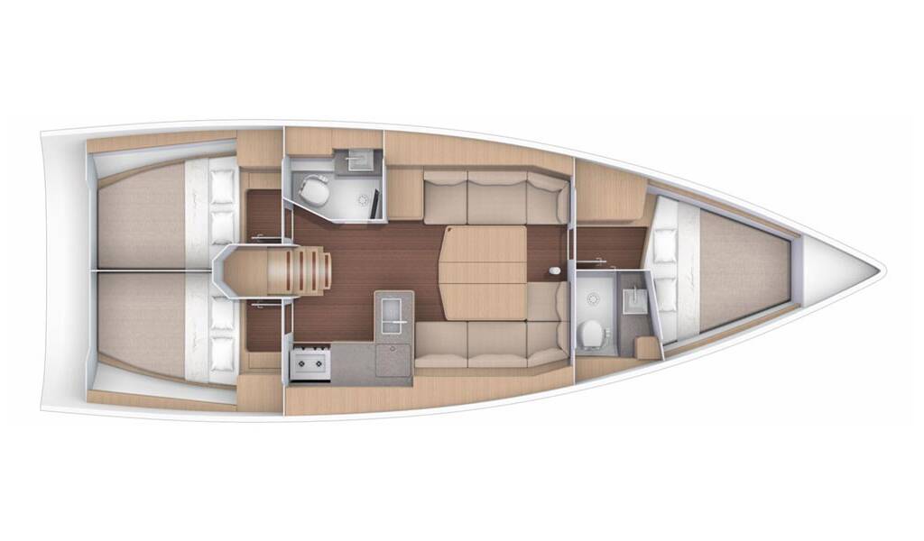 Sailing yacht Dufour 390 Dupina 23, built in 2023 is anchored in the Marina Kornati, Biograd, Zadar region, Croatia. It has 3 cabins, can accommodate 6 + 2 people and has 2 toilets. Bed linen and kitchen equipment are included in the price.