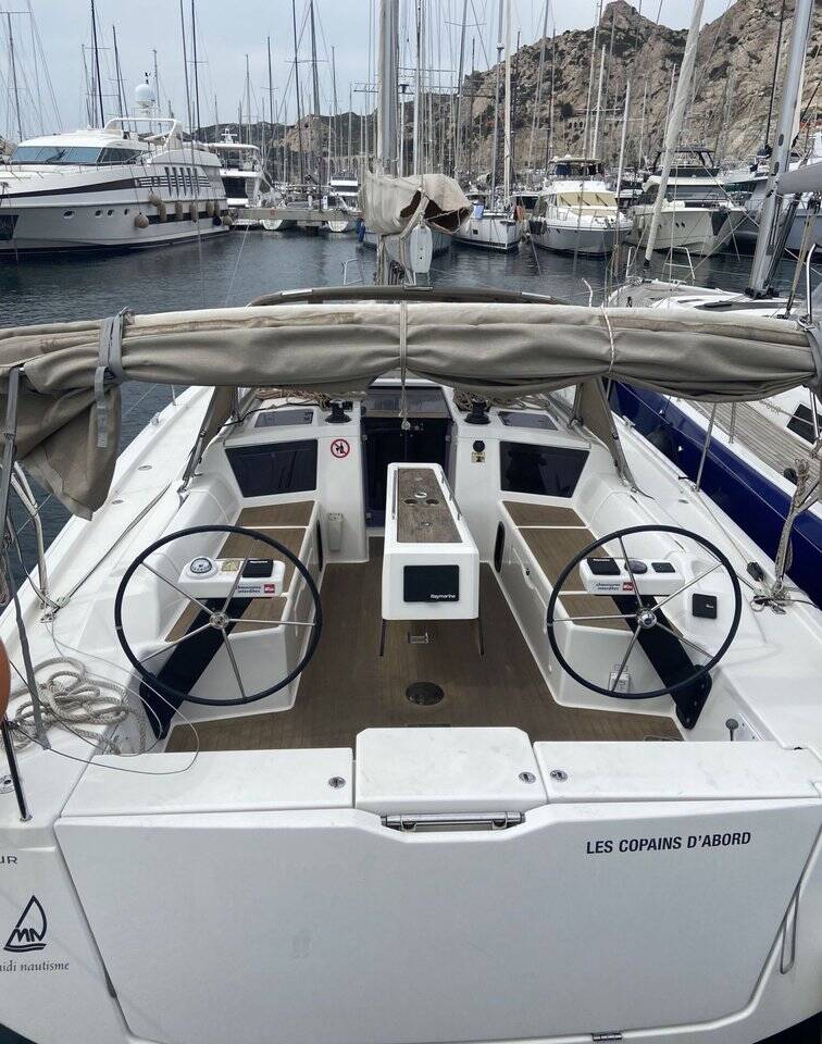 Sailing yacht Dufour 390 GL Les Copains D'abord, built in 2020 is anchored in the Marseille, Corbières Port Services, Provence-Alpes-Côte d'Azur, France. It has 3 cabins, can accommodate 6 + 2 people and has 2 toilets. Bed linen and kitchen equipment are included in the price.