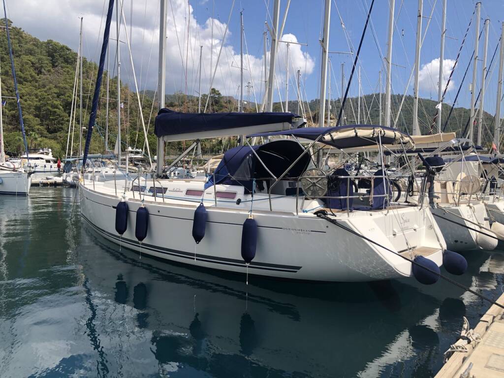 Sailing yacht Dufour 425 GL Spica, built in 2009 is anchored in the Marmaris, Netsel Marina, Aegean, Turkey. It has 3 cabins, can accommodate 6 people and has 2 toilets. Bed linen and kitchen equipment are included in the price.