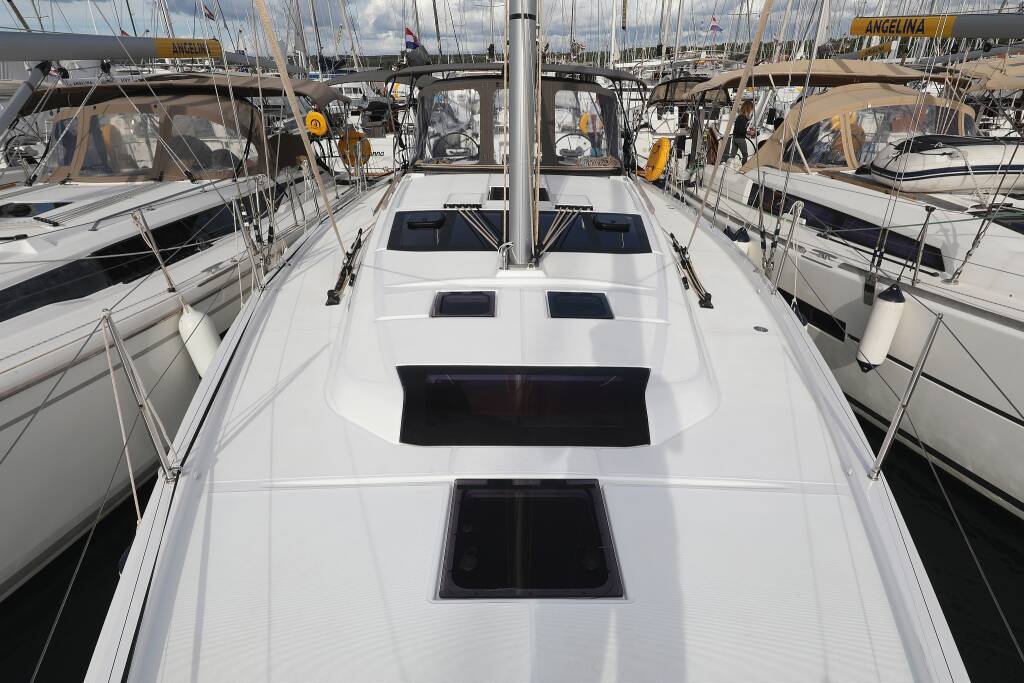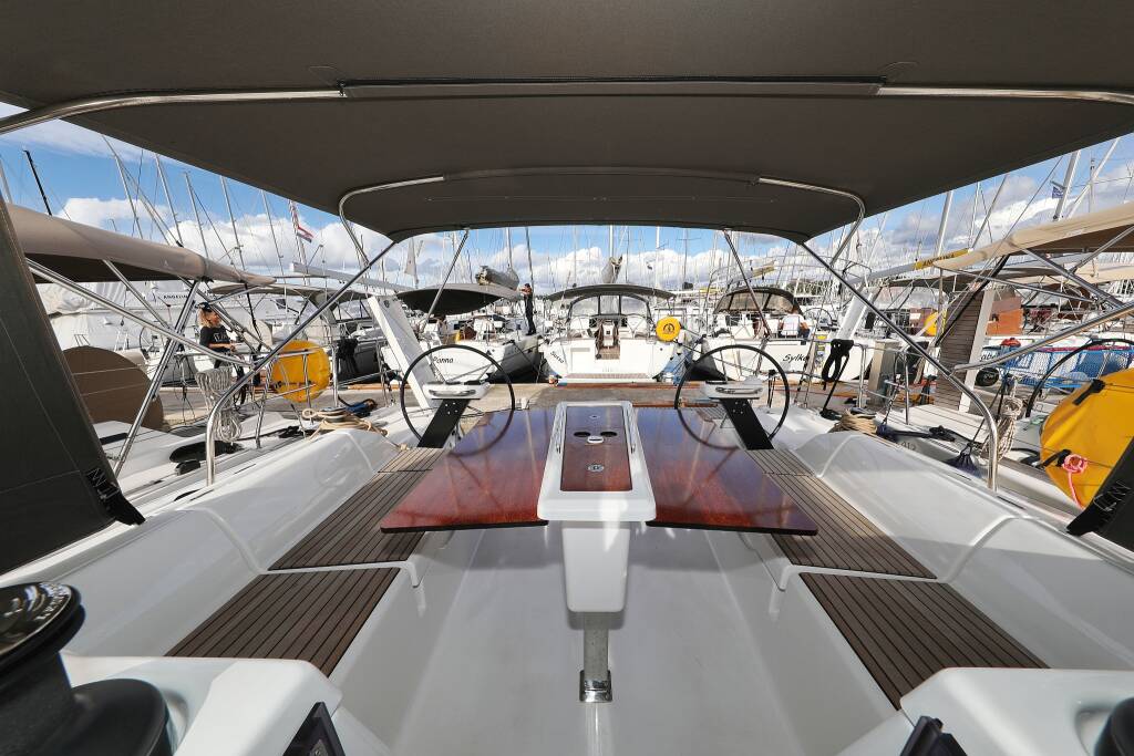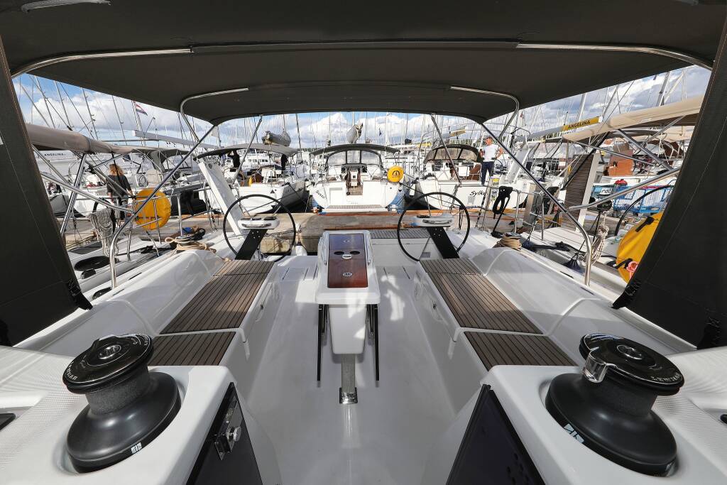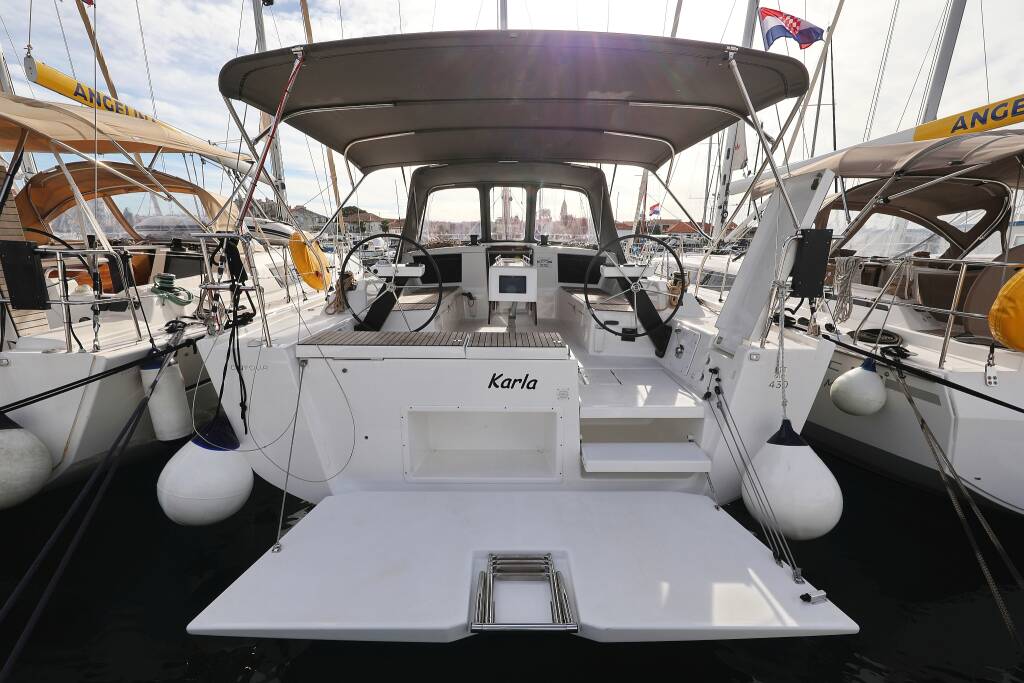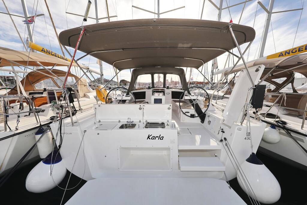 Sailing yacht Dufour 430 Karla, built in 2023 is anchored in the Marina Šangulin, Biograd, Zadar region, Croatia. It has 4 cabins, can accommodate 8 + 2 people and has 2 toilets. Bed linen and kitchen equipment are included in the price.