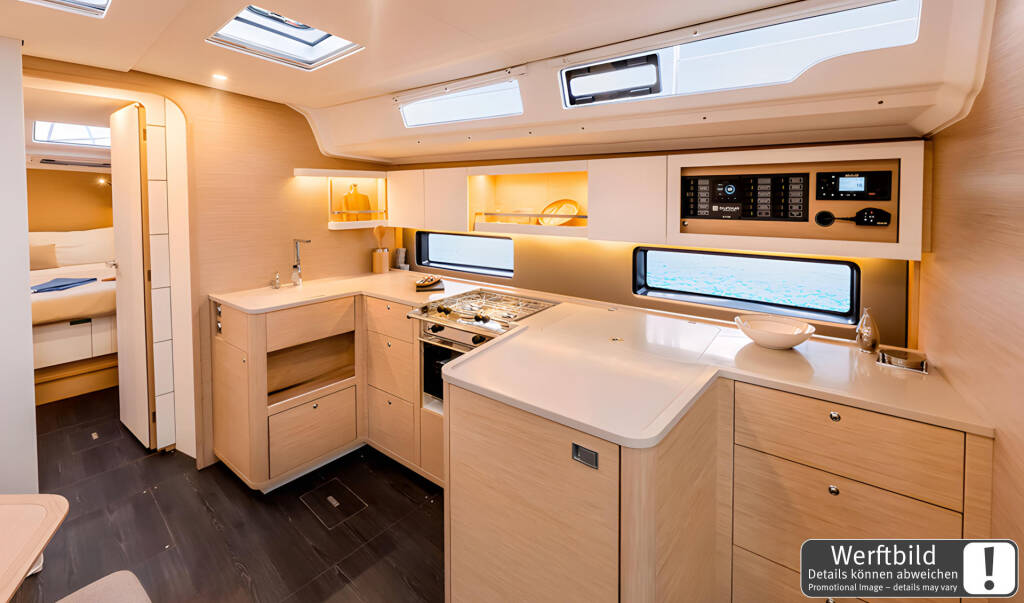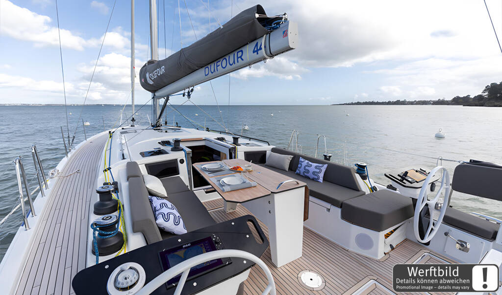 Sailing yacht Dufour 44 Gimme! Gimme!, built in 2026 is anchored in the Palma de Mallorca, Marina Naviera Balear, Balearic Islands, Spain. It has 3 cabins, can accommodate 6 people and has 2 toilets. Bed linen and kitchen equipment are included in the price.