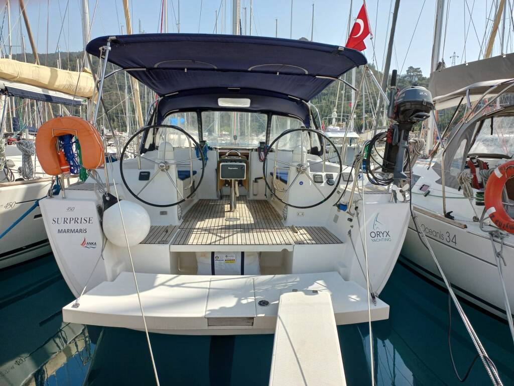 Sailing yacht Dufour 450 GL Surprise, built in 2013 is anchored in the Marmaris, Netsel Marina, Aegean, Turkey. It has 4 cabins, can accommodate 8 people and has 2 toilets. Bed linen and kitchen equipment are included in the price.