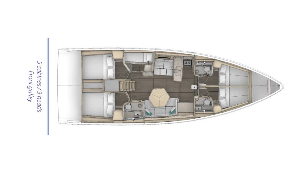 Sailing yacht Dufour 48 Bourini, built in 2026 is anchored in the Lefkas main port, Ionian Islands, Greece. It has 5 cabins, can accommodate 10 + 2 people and has 3 toilets. Bed linen and kitchen equipment are included in the price.