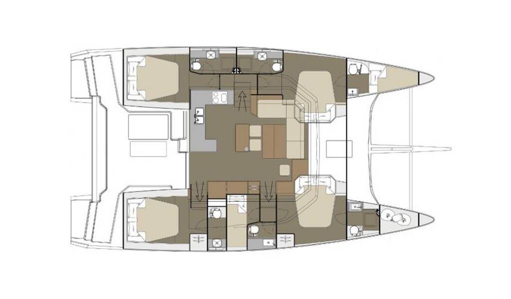 Catamaran Dufour 48 Catamaran Bahia Serena, built in 2019 is anchored in the Marina Kremik, Primosten, Šibenik region, Croatia. It has 5 + 1 cabins, can accommodate 9 + 1 + 1 people and has 5 + 1 toilets. Bed linen and kitchen equipment are included in the price.