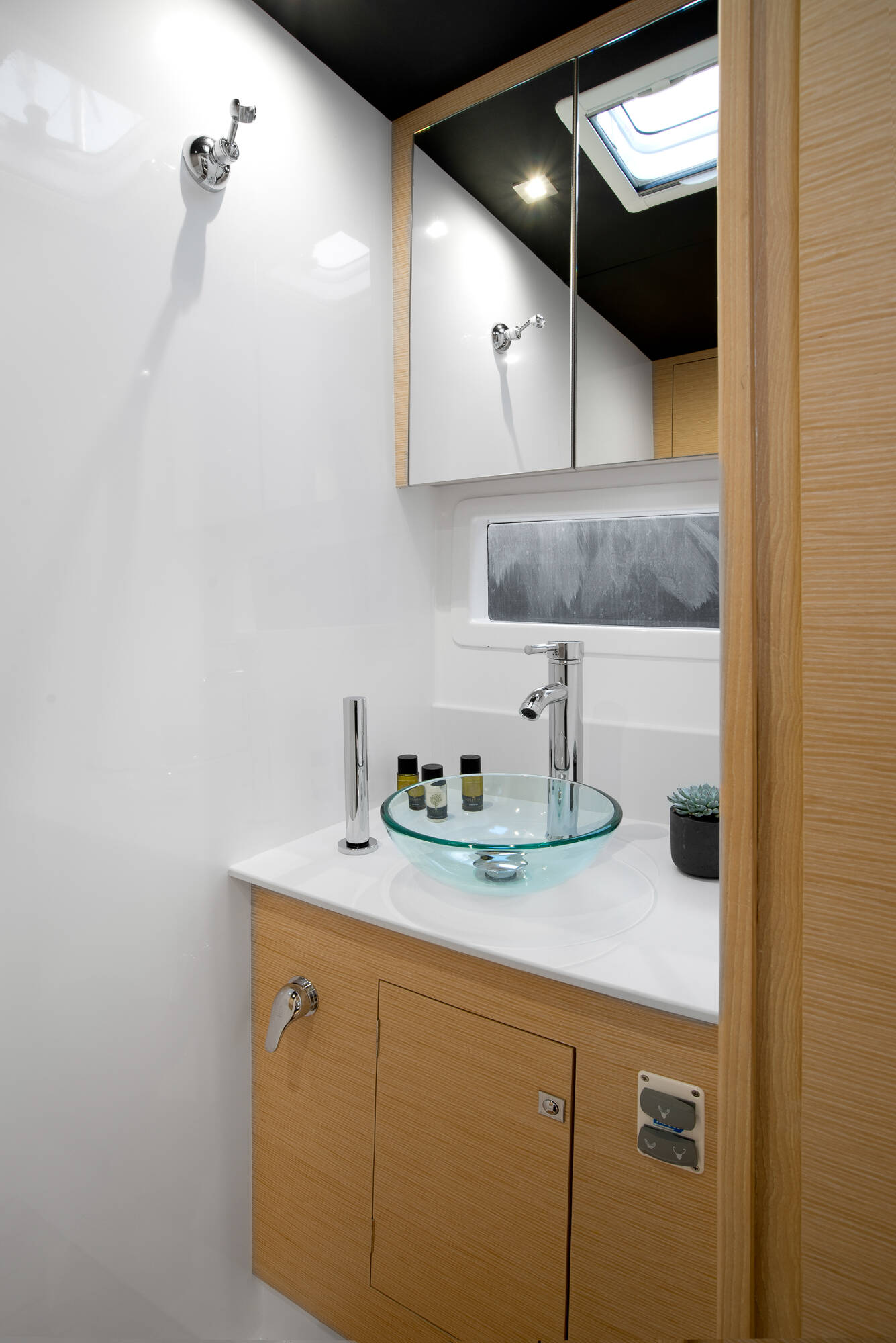 Catamaran Dufour 48 Catamaran Orfeas, built in 2023 is anchored in the Lefkas main port, Ionian Islands, Greece. It has 5 + 1 cabins, can accommodate 10 + 2 people and has 5 + 1 toilets. Bed linen and kitchen equipment are included in the price.