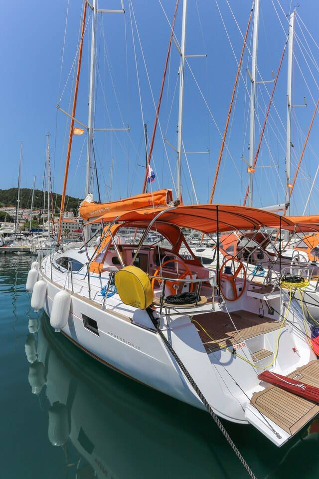 Sailing yacht Elan Impression 45 Star, built in 2016 is anchored in the ACI Marina Split, Split region, Croatia. It has 4 cabins, can accommodate 8 + 2 people and has 2 toilets. Bed linen and kitchen equipment are included in the price.
