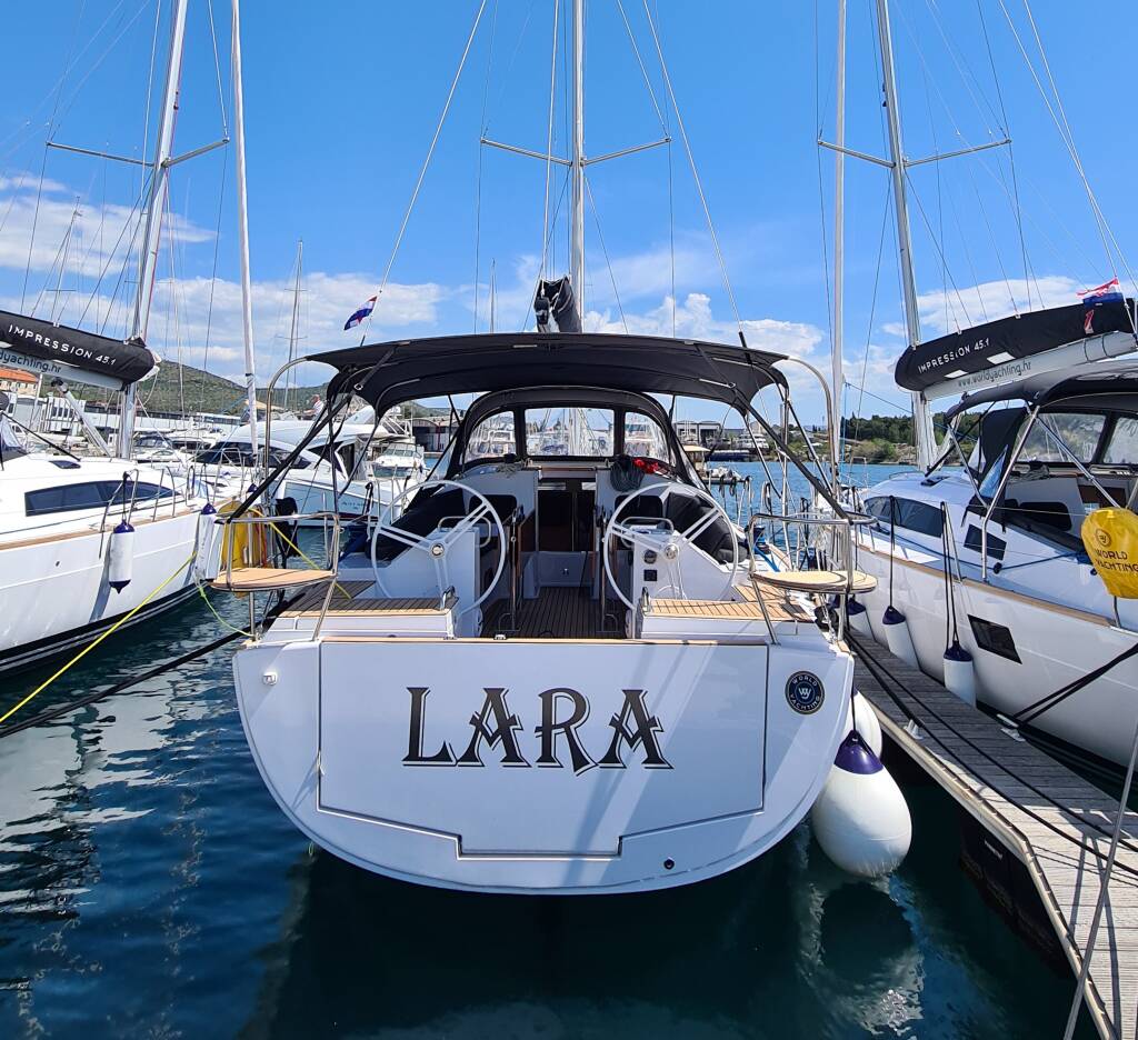 Sailing yacht Elan Impression 45.1 Lara, built in 2022 is anchored in the Trogir, Marina Trogir (ex.SCT), Split region, Croatia. It has 4 cabins, can accommodate 8 + 2 people and has 2 toilets. Bed linen and kitchen equipment are included in the price.