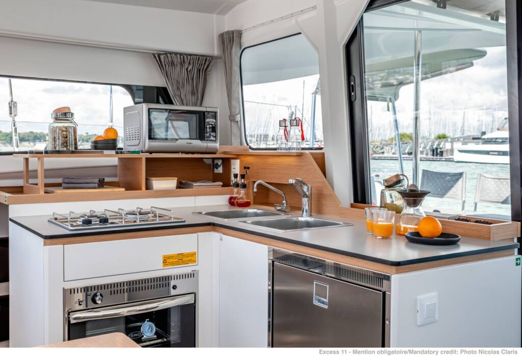 Catamaran Excess 11 HEGOAK, built in 2023 is anchored in the St. Martin, Marina de L'Anse Marcel, St. Martin, Caribbean. It has 4 + 2 cabins, can accommodate 8 + 2 + 2 people and has 2 toilets. Bed linen and kitchen equipment are included in the price.
