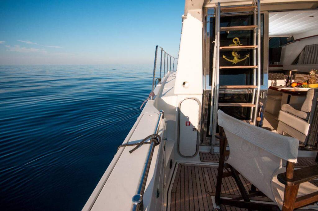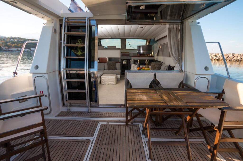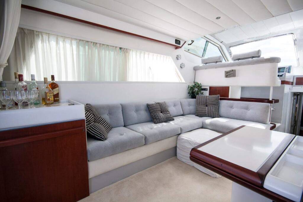 Motor yacht Ferretti 47 Vanilia, built in 1993 is anchored in the Mykonos, Cyclades, Greece. It has 3 + 1 cabins, can accommodate 6 + 2 people and has 2 toilets. Bed linen and kitchen equipment are included in the price.