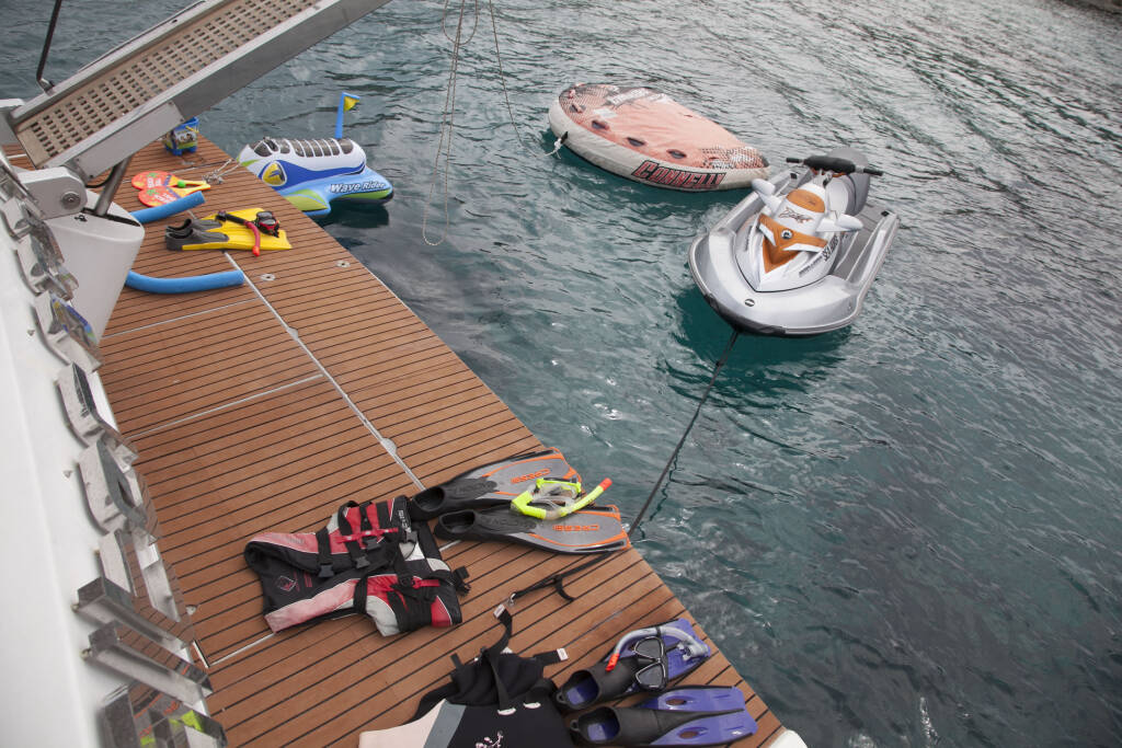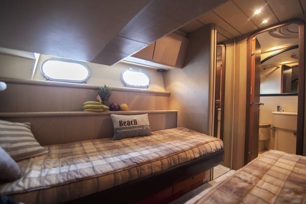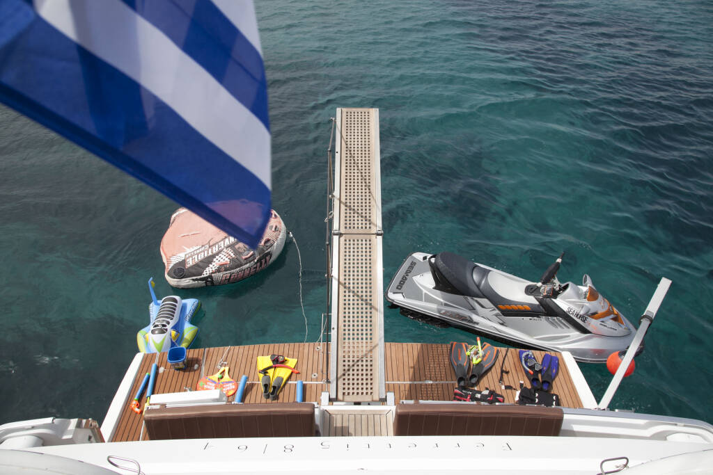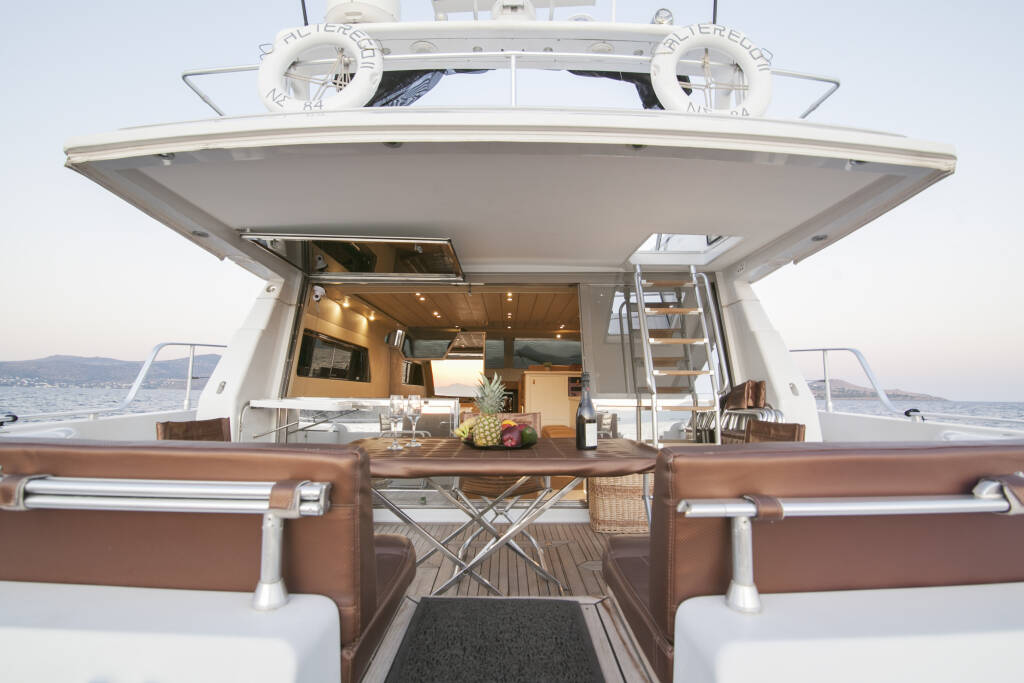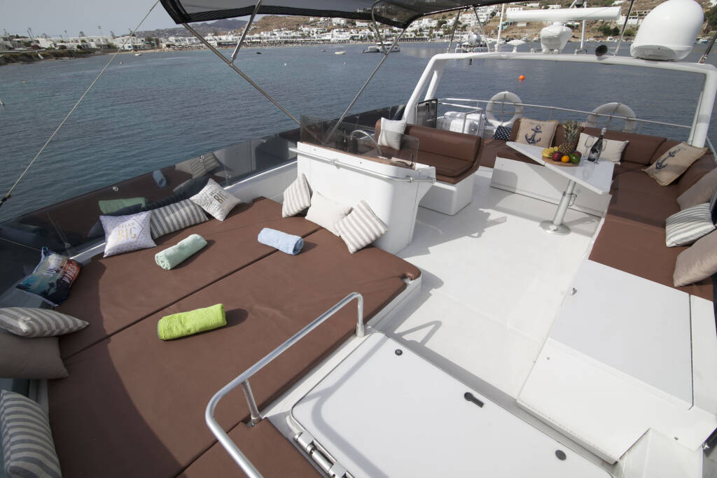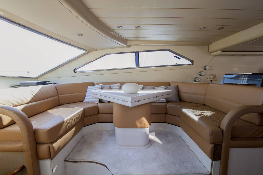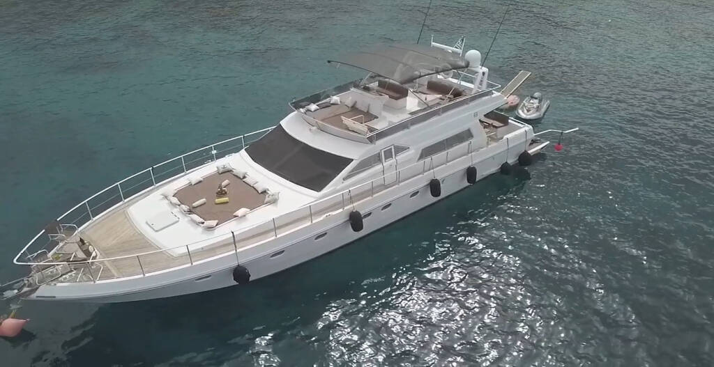 Motor yacht Ferretti Yachts 58 Alter Ego II, built in 1991 is anchored in the Mykonos, Cyclades, Greece. It has 3 + 1 cabins, can accommodate 6 + 3 people and has 3 + 1 toilets. Bed linen and kitchen equipment are included in the price.