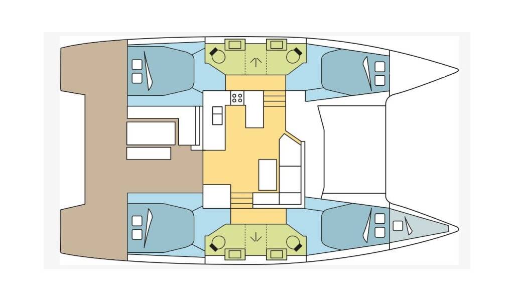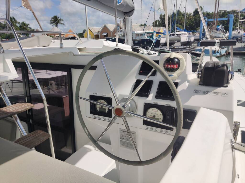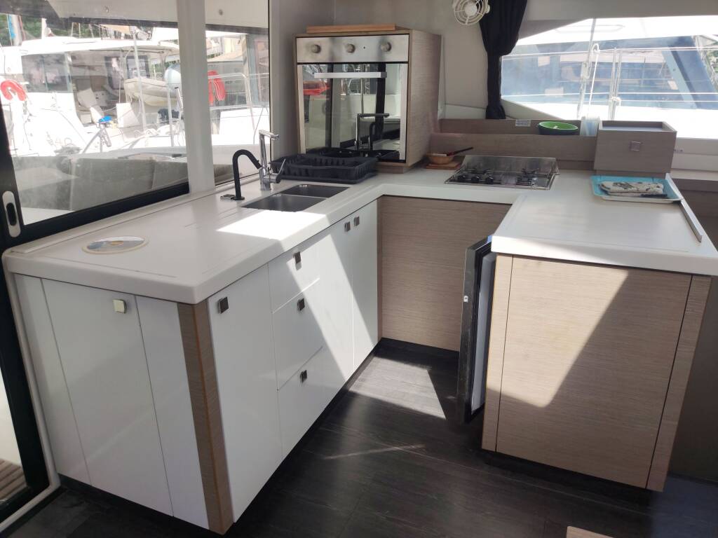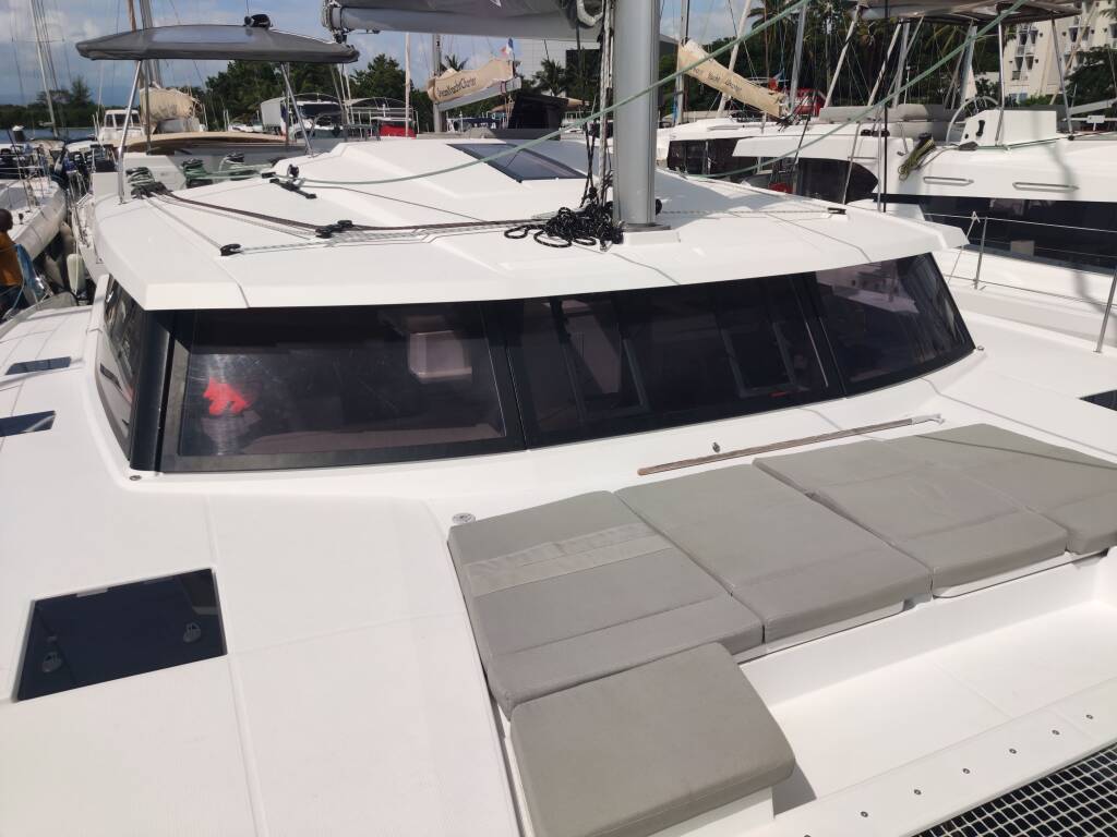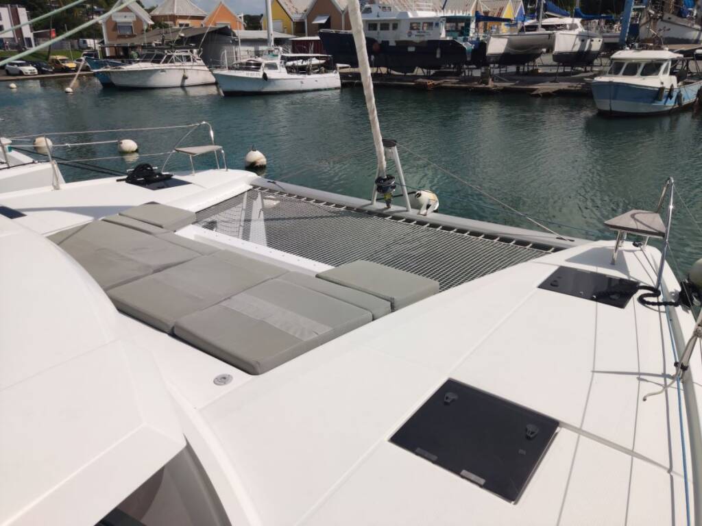 Catamaran Fountaine Pajot Astrea 42 Atchoum, built in 2019 is anchored in the Guadeloupe, La Marina Bas du Fort, Guadeloupe, Caribbean. It has 4 + 2 cabins, can accommodate 8 + 2 people and has 4 toilets. Bed linen and kitchen equipment are included in the price.