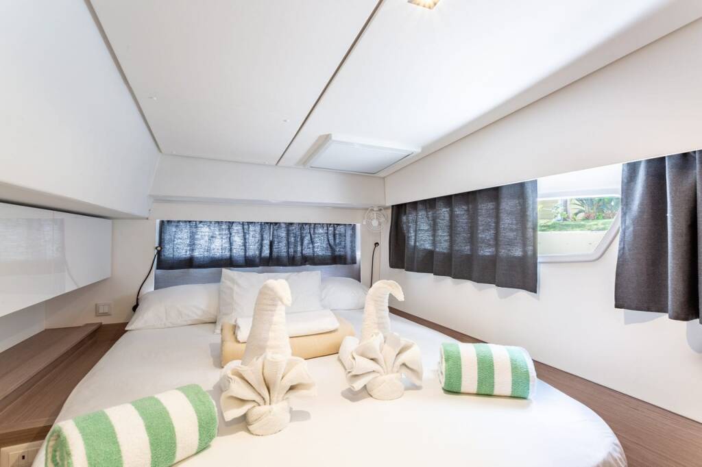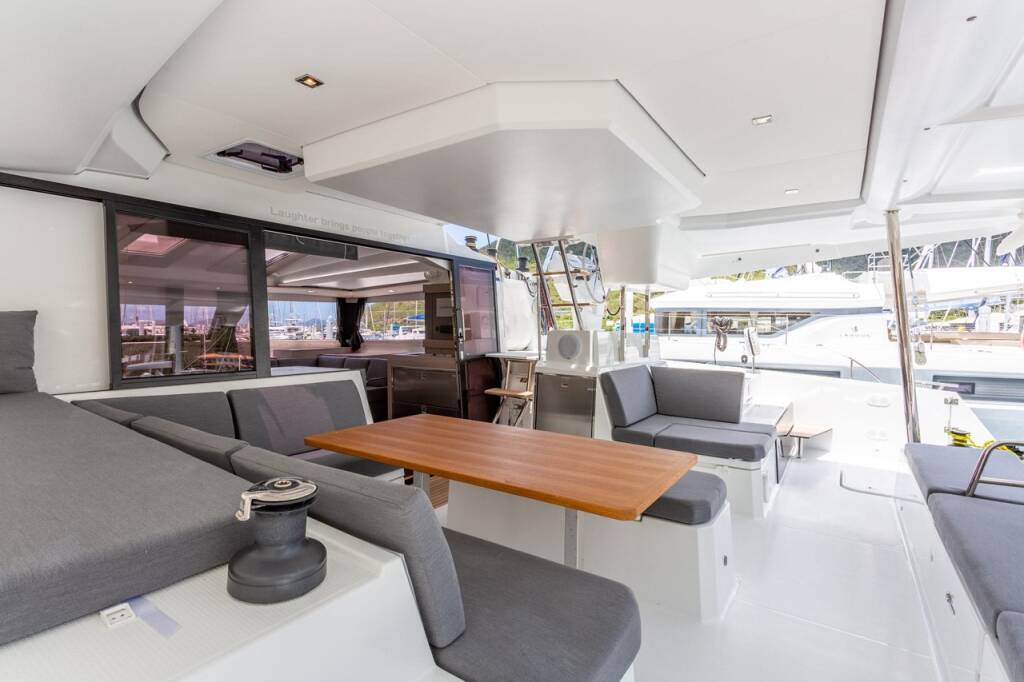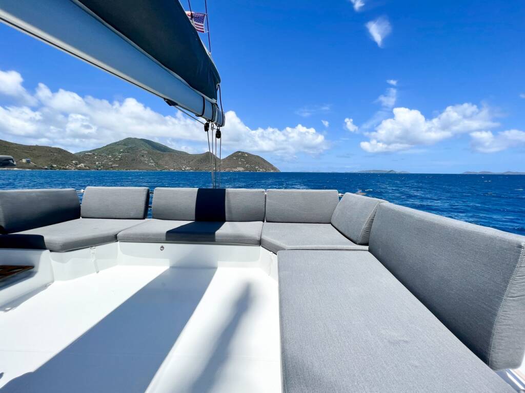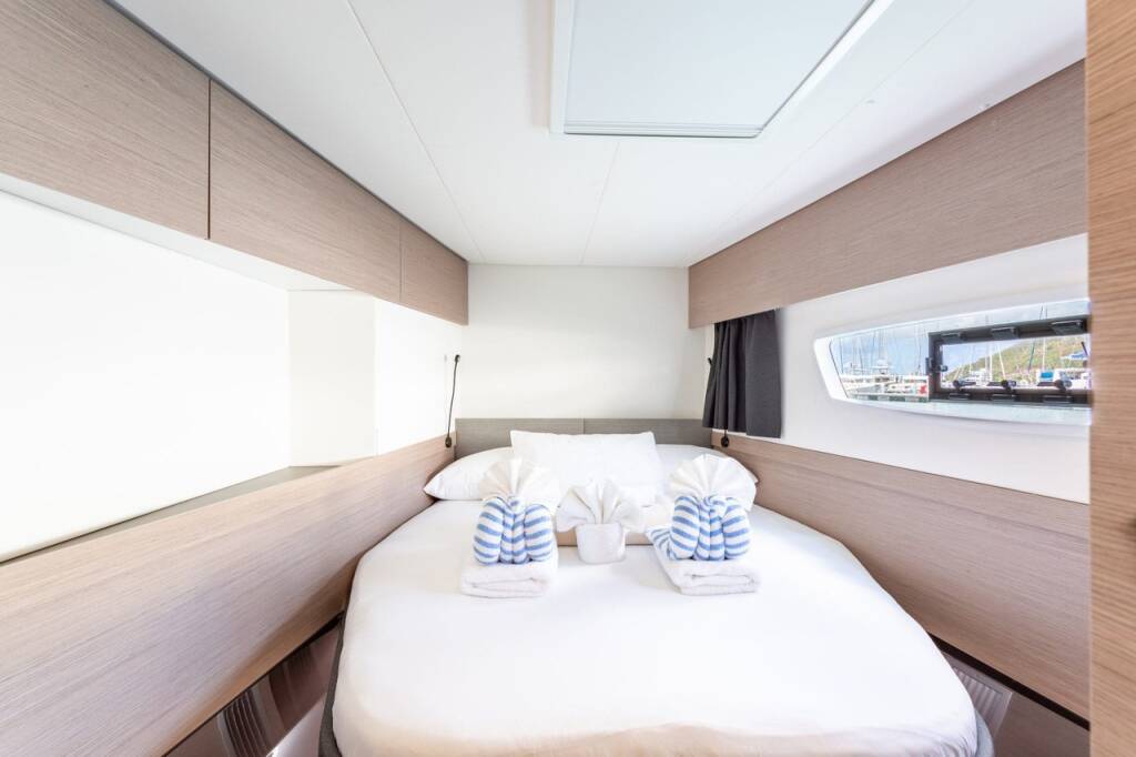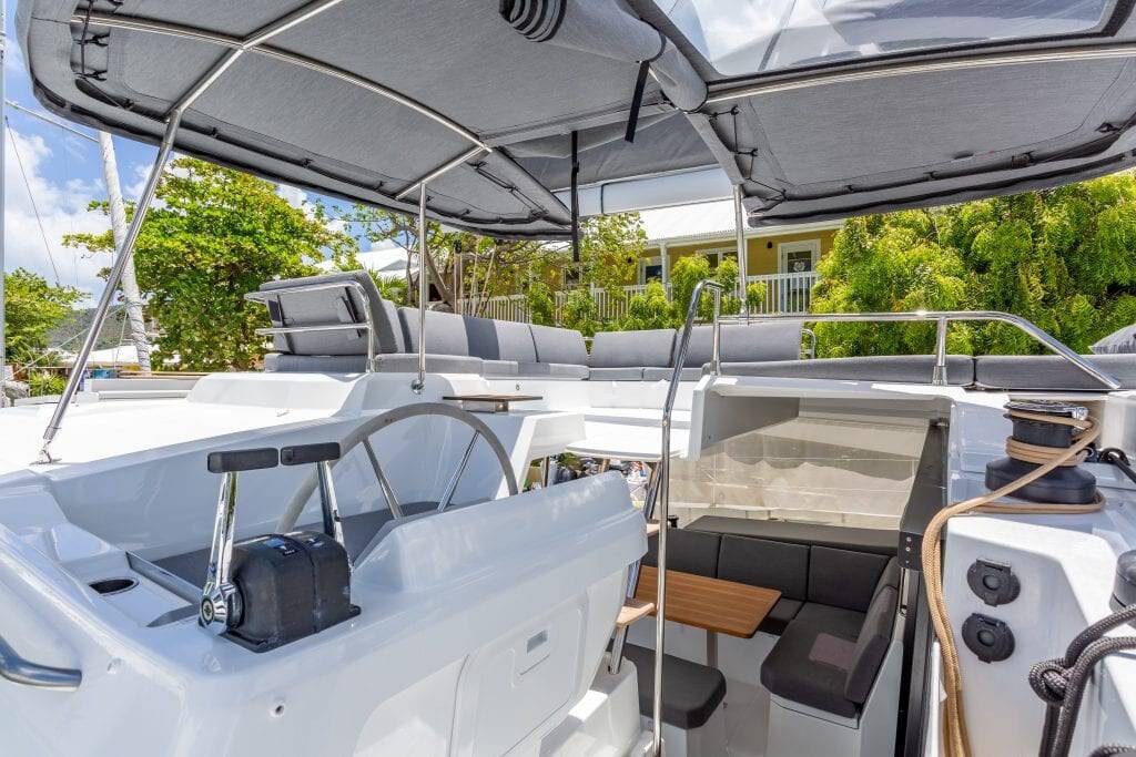 Catamaran Fountaine Pajot Elba 45 Gelos, built in 2021 is anchored in the BVI, Tortola, Nanny Cay Marina, British Virgin Islands, British Virgin Islands. It has 4 + 1 cabins, can accommodate 8 + 1 people and has 4 toilets. Bed linen and kitchen equipment are included in the price.