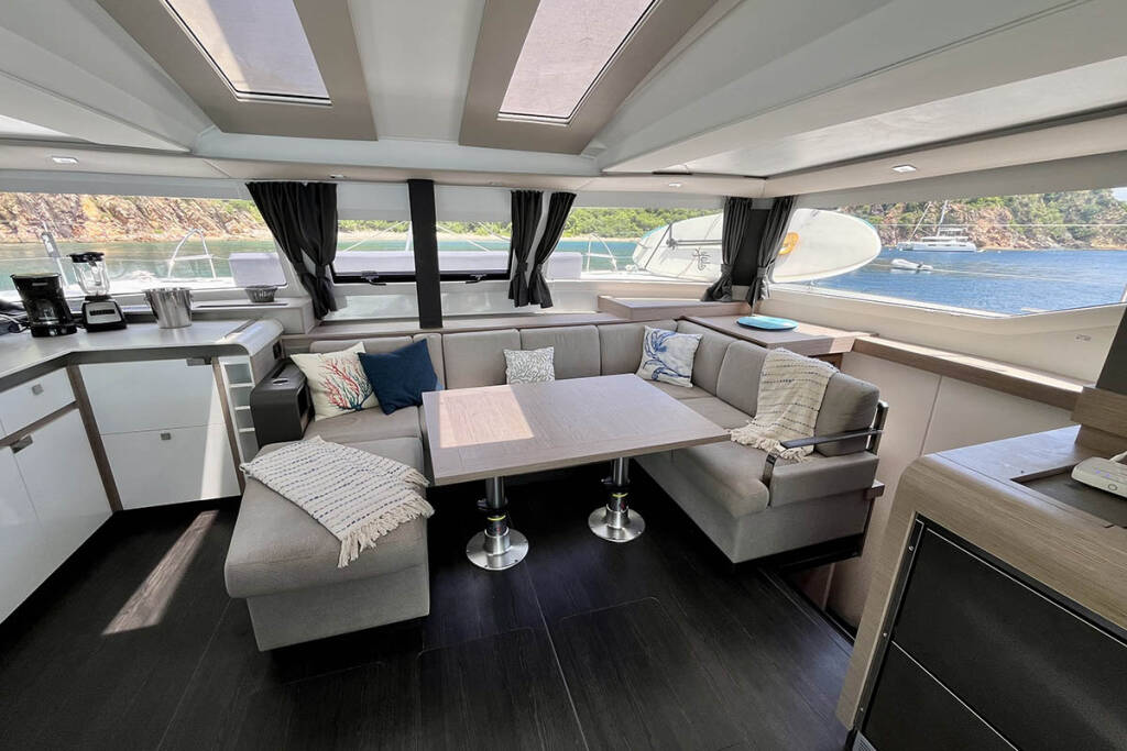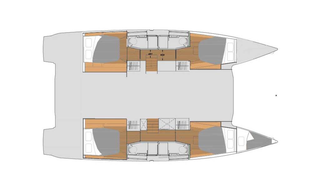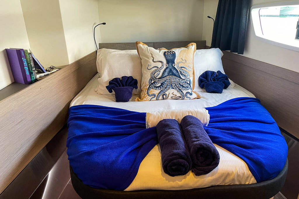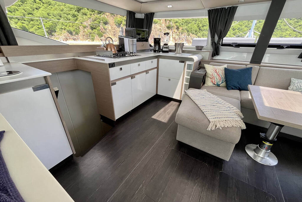 Catamaran Fountaine Pajot Elba 45 Spindrift, built in 2023 is anchored in the BVI, Tortola, Nanny Cay Marina, British Virgin Islands, British Virgin Islands. It has 4 + 1 cabins, can accommodate 8 + 1 + 1 people and has 4 toilets. Bed linen and kitchen equipment are included in the price.