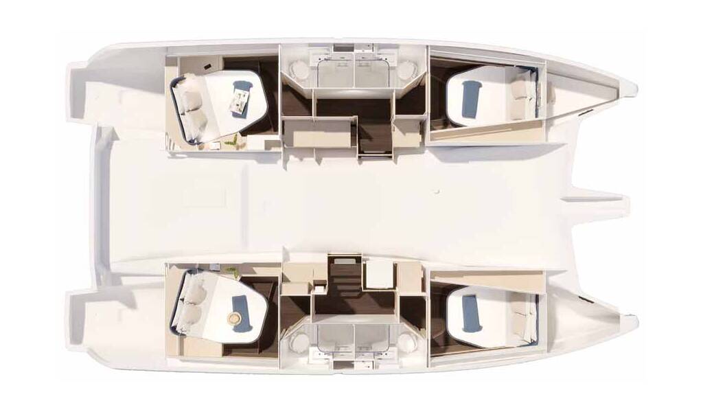 Catamaran Fountaine Pajot FP 44 Quatuor Makatea, built in 2026 is anchored in the Trogir, Marina Trogir (ex.SCT), Split region, Croatia. It has 4 + 1 cabins, can accommodate 8 + 2 + 1 people and has 4 toilets. Bed linen and kitchen equipment are included in the price.