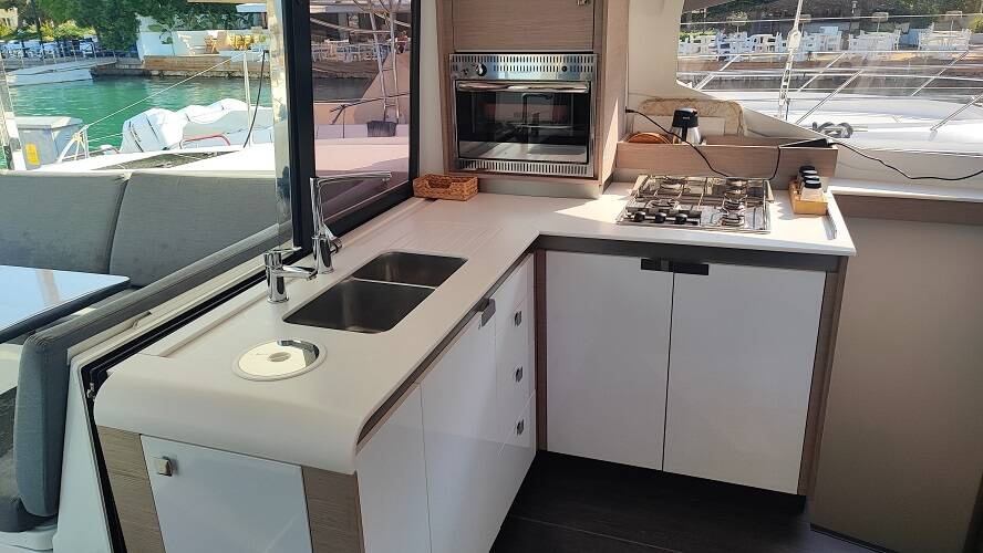 Catamaran Fountaine Pajot Isla 40 Blue Orion, built in 2022 is anchored in the Fethiye, Yacht Classic Hotel Marina, Aegean, Turkey. It has 4 + 1 cabins, can accommodate 8 + 1 people and has 4 toilets. Bed linen and kitchen equipment are included in the price.