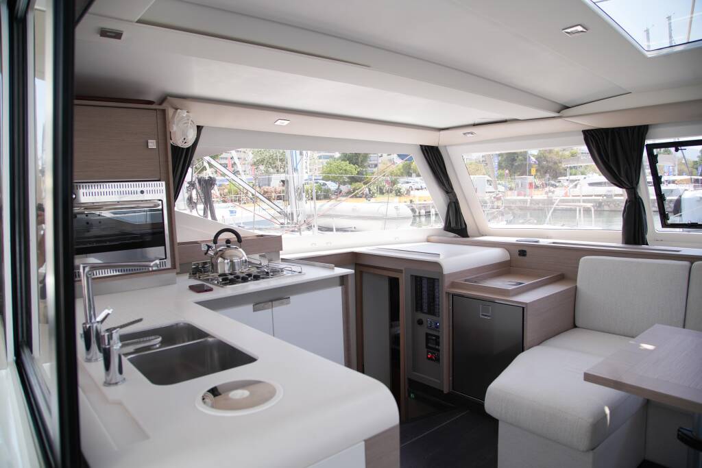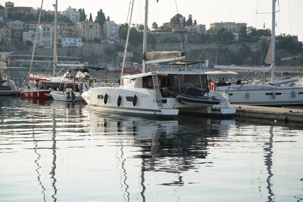 Catamaran Fountaine Pajot Isla 40 - Quatuor Anasa, built in 2023 is anchored in the Port of Kavala, Northern Greece/Aegean, Greece. It has 4 + 1 cabins, can accommodate 8 + 2 + 1 people and has 4 toilets. Bed linen and kitchen equipment are included in the price.