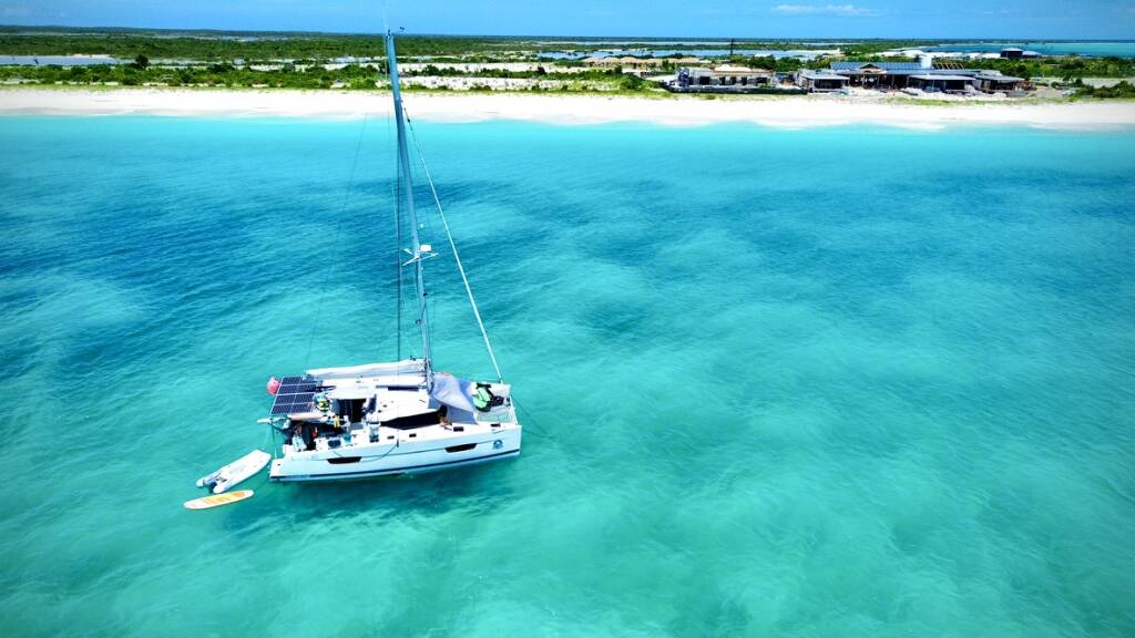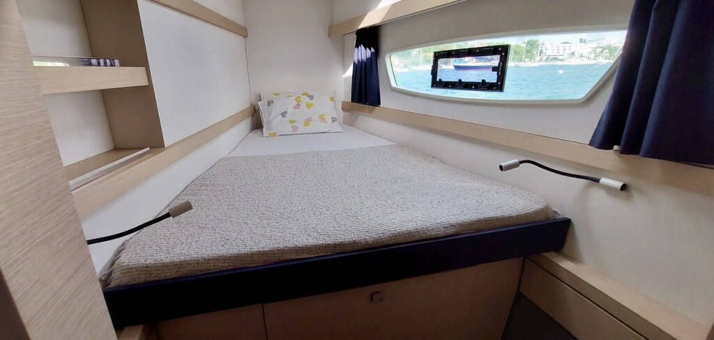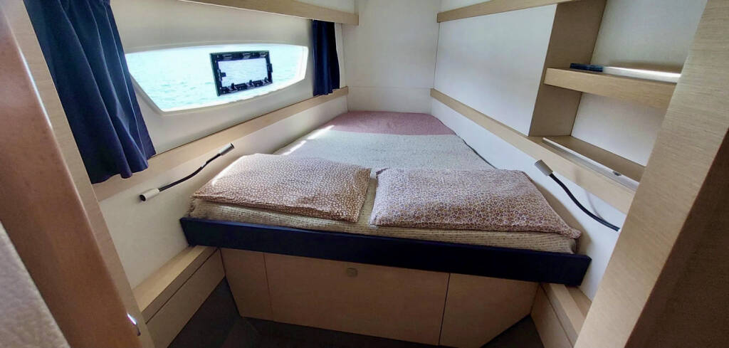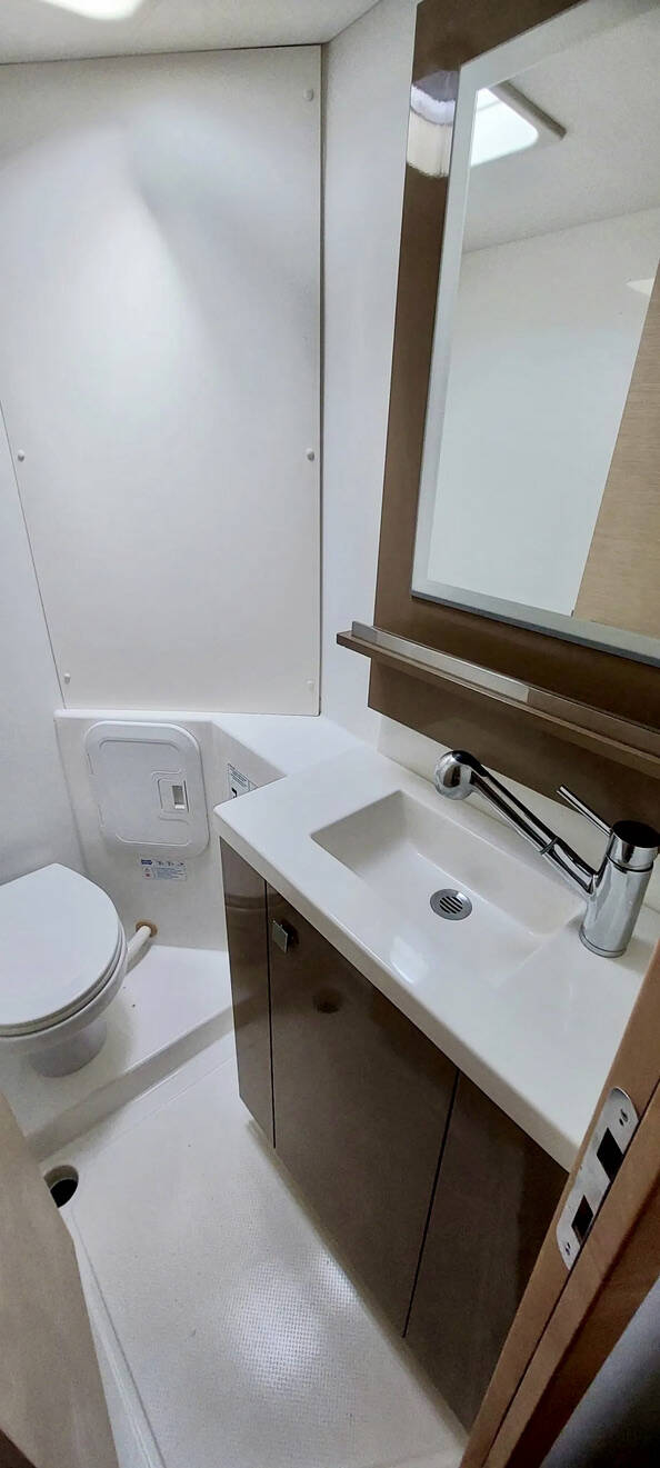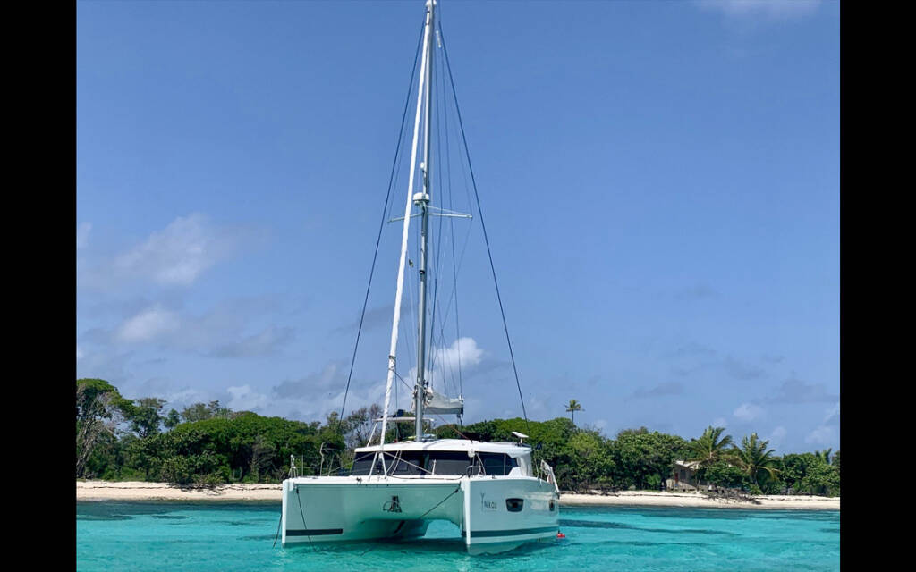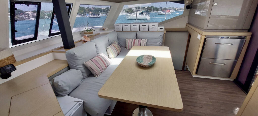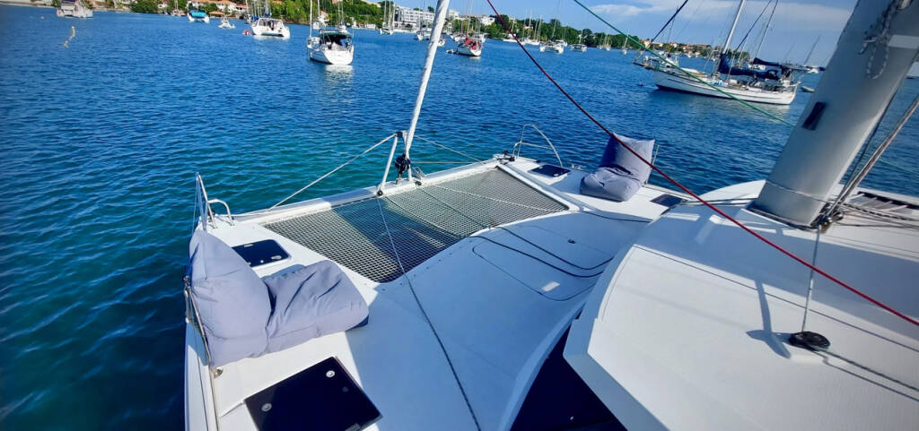 Catamaran Fountaine Pajot Lucia 40 Aqua Panda, built in 2016 is anchored in the Antigua, Jolly Harbour Marina, Antigua, Caribbean. It has 4 cabins, can accommodate 4 people and has 3 toilets. Bed linen and kitchen equipment are included in the price.