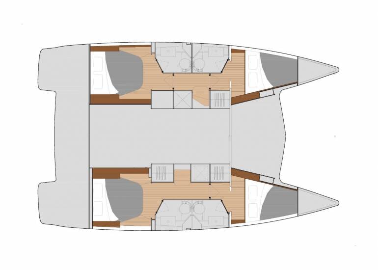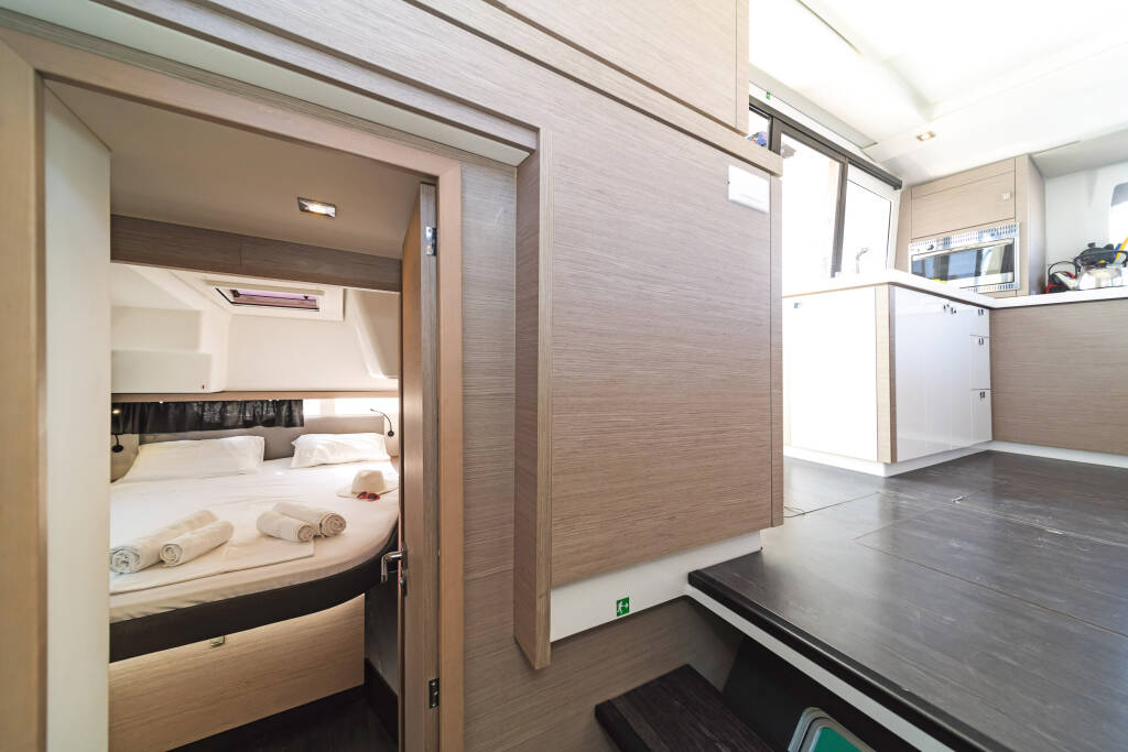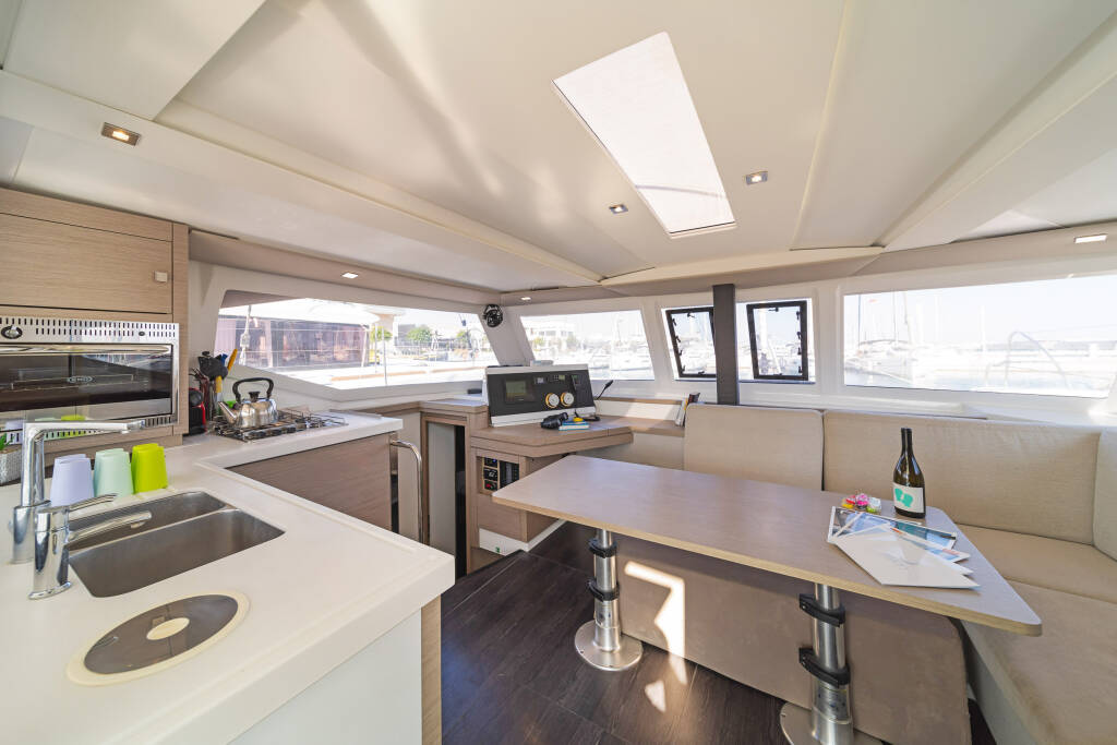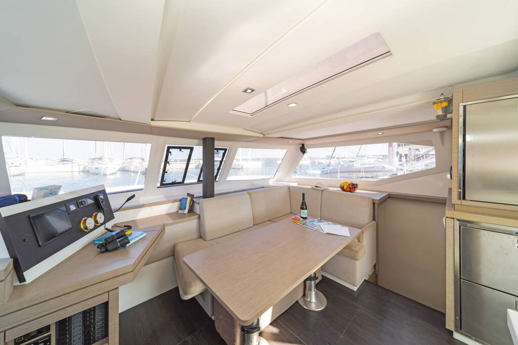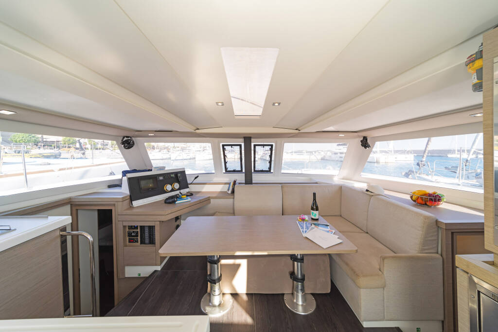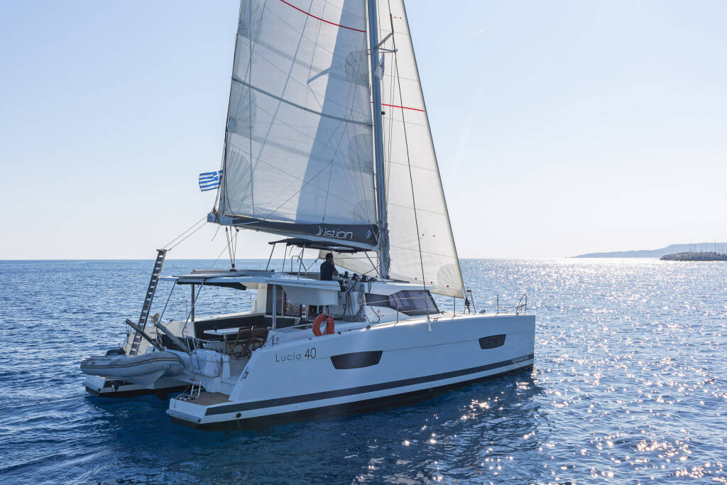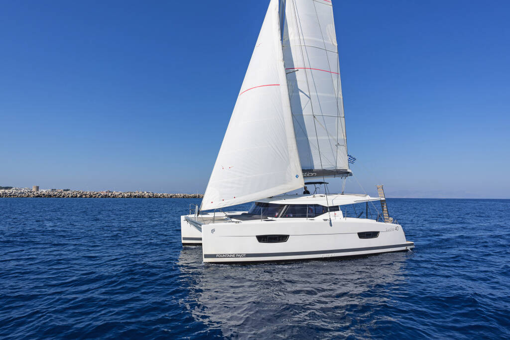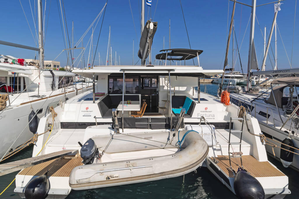 Catamaran Fountaine Pajot Lucia 40 Fortuna, built in 2020 is anchored in the Rhodes New Marina, Dodecanese, Greece. It has 4 cabins, can accommodate 8 people and has 4 toilets. Bed linen and kitchen equipment are included in the price.