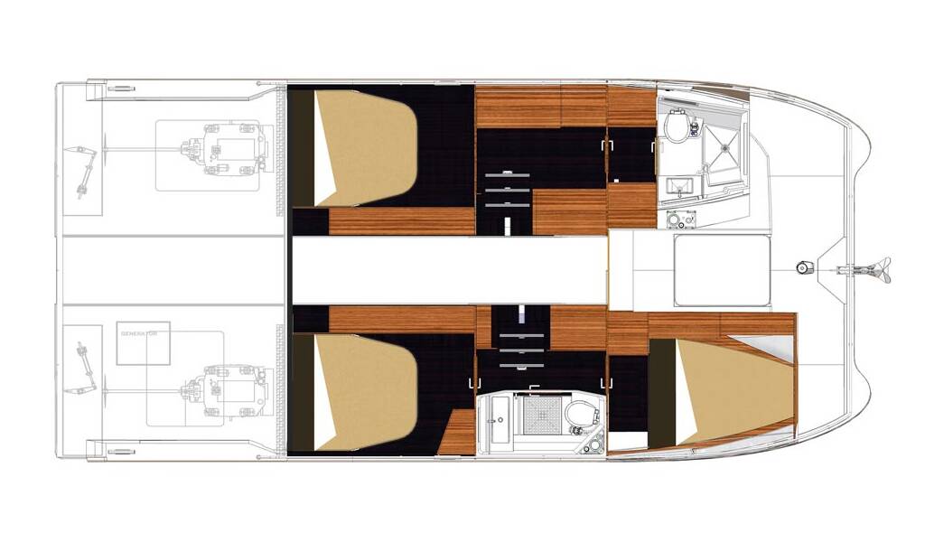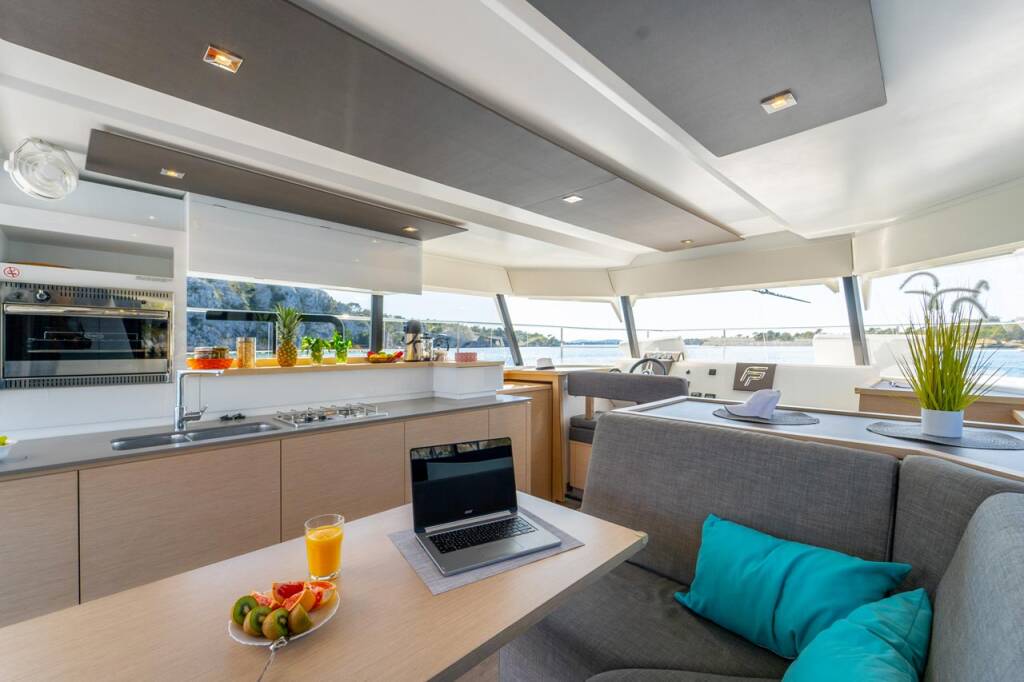 Power catamaran Fountaine Pajot MY 37 Mon Ami, built in 2019 is anchored in the Marina Mandalina, Sibenik, Šibenik region, Croatia. It has 3 cabins, can accommodate 6 people and has 2 toilets. Bed linen and kitchen equipment are included in the price.