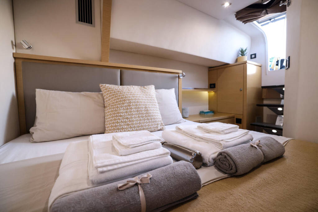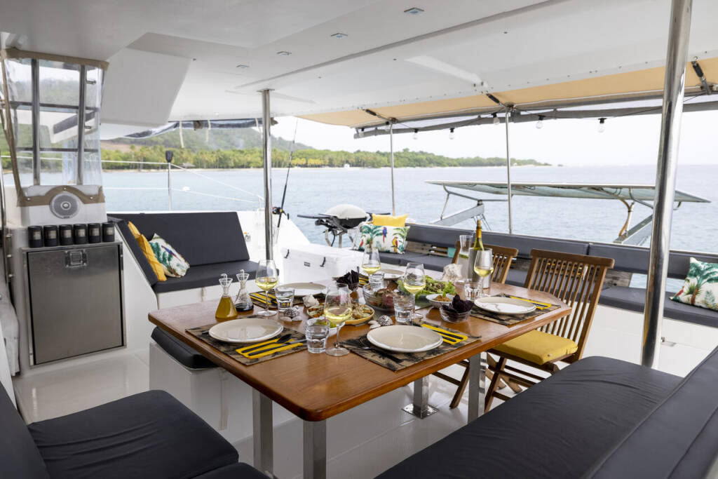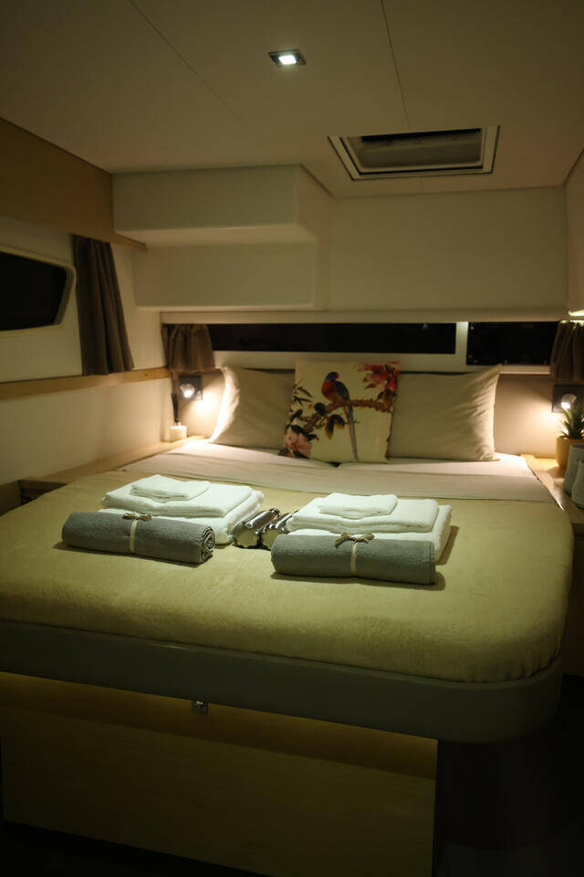 Catamaran Fountaine Pajot Saba 50 Purpose, built in 2014 is anchored in the St. Martin, Marina Port de Plaisance, St. Martin, Caribbean. It has 5 + 2 cabins, can accommodate 8 people and has 6 toilets. Bed linen and kitchen equipment are included in the price.