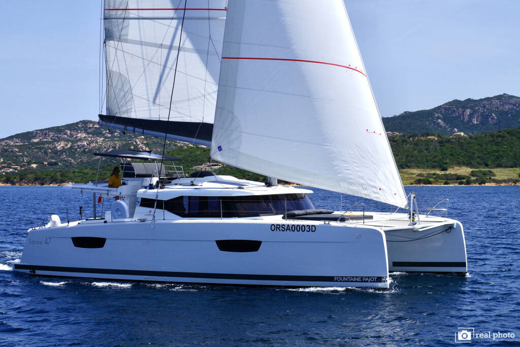 Catamaran Fountaine Pajot Saona 47 Quintet Orsa 3, built in 2022 is anchored in the Sardinia, Cannigione, Sardinia, Italy. It has 5 + 1 cabins, can accommodate 10 + 1 + 1 people and has 4 + 1 toilets. Bed linen and kitchen equipment are included in the price.