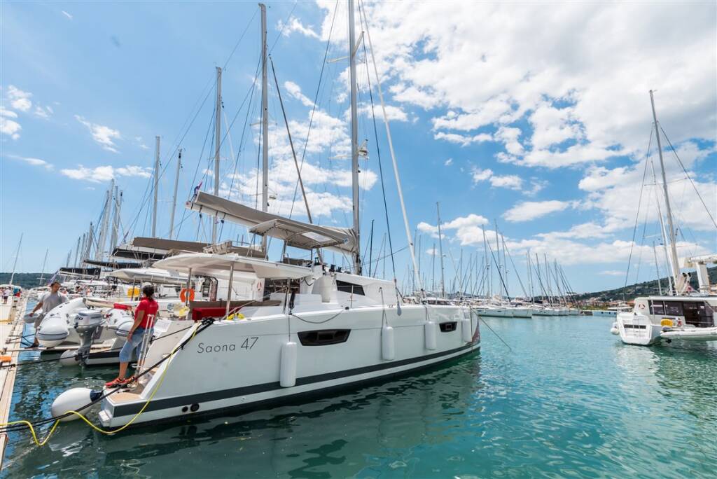 Catamaran Fountaine Pajot Saona 47 Quintet Sunny Wave, built in 2018 is anchored in the Trogir, Yachtclub Seget (Marina Baotić), Split region, Croatia. It has 5 + 1 cabins, can accommodate 10 + 2 people and has 5 toilets. Bed linen and kitchen equipment are included in the price.