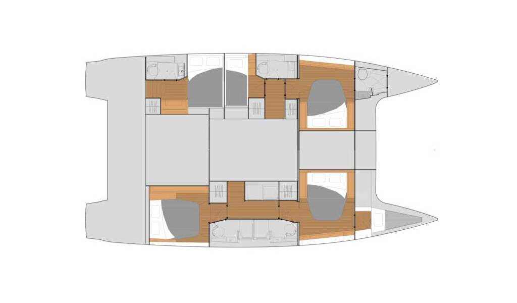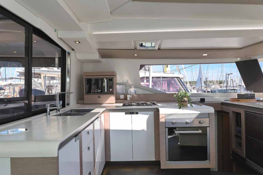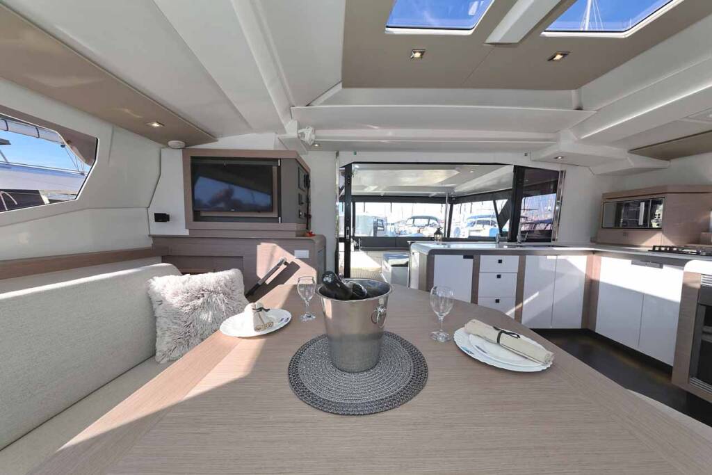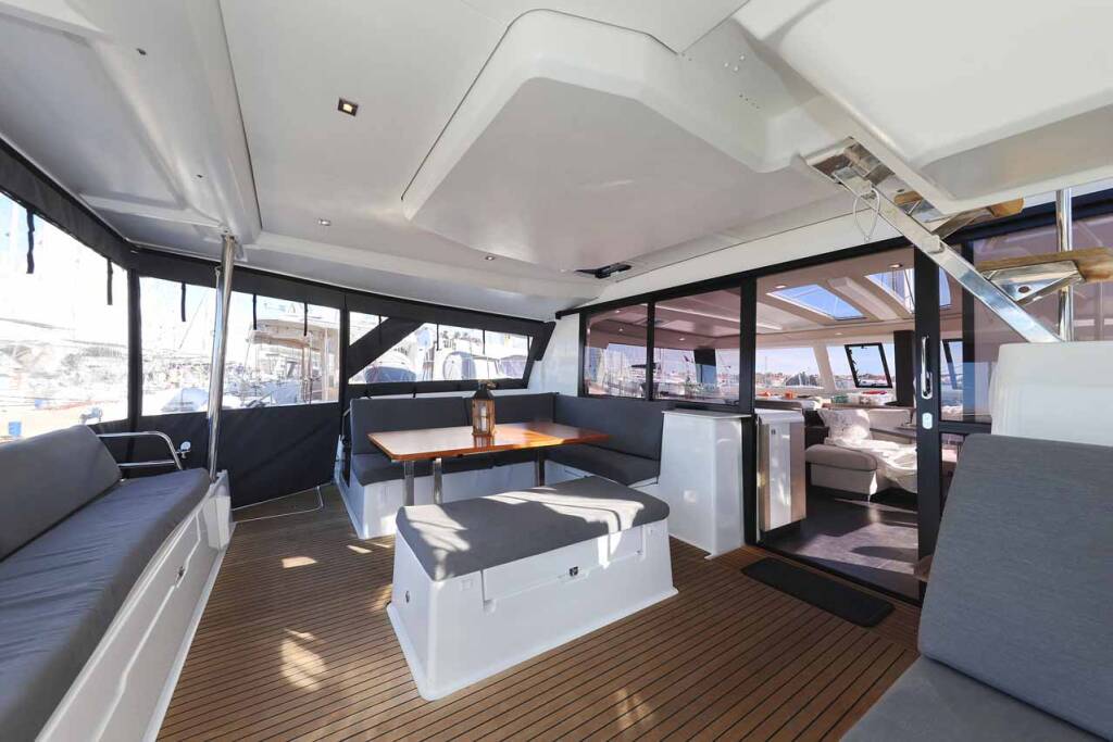 Catamaran Fountaine Pajot Tanna 47 Maya I, built in 2023 is anchored in the Marina Kornati, Biograd, Zadar region, Croatia. It has 5 + 1 cabins, can accommodate 10 + 1 + 1 people and has 5 toilets. Bed linen and kitchen equipment are included in the price.