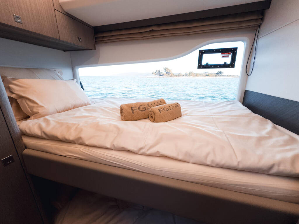 Motor yacht Galeon 440 FGStar Mini, built in 2024 is anchored in the Trogir, Yachtclub Seget (Marina Baotić), Split region, Croatia. It has 3 cabins, can accommodate 6 people and has 2 toilets. Bed linen and kitchen equipment are included in the price.