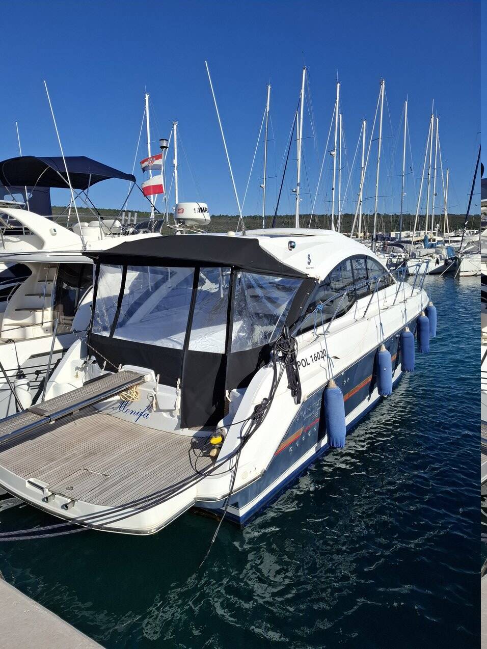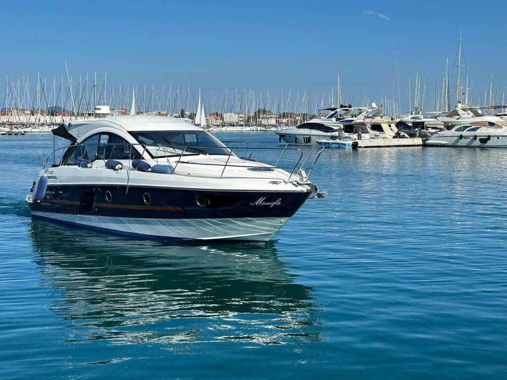 Motor yacht Gran Turismo 38 Monifa, built in 2015 is anchored in the Sukosan, D-Marin Dalmacija Marina, Zadar region, Croatia. It has 2 cabins, can accommodate 6 people and has 1 toilets. Bed linen and kitchen equipment are included in the price.