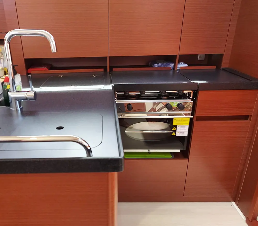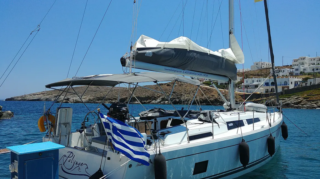Sailing yacht Hanse 418 Polynoe, built in 2021 is anchored in the Lavrion - Olympic Marine, Athens area/Saronic/Peloponese, Greece. It has 3 cabins, can accommodate 6 + 2 people and has 2 toilets. Bed linen and kitchen equipment are included in the price.