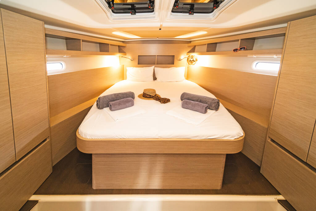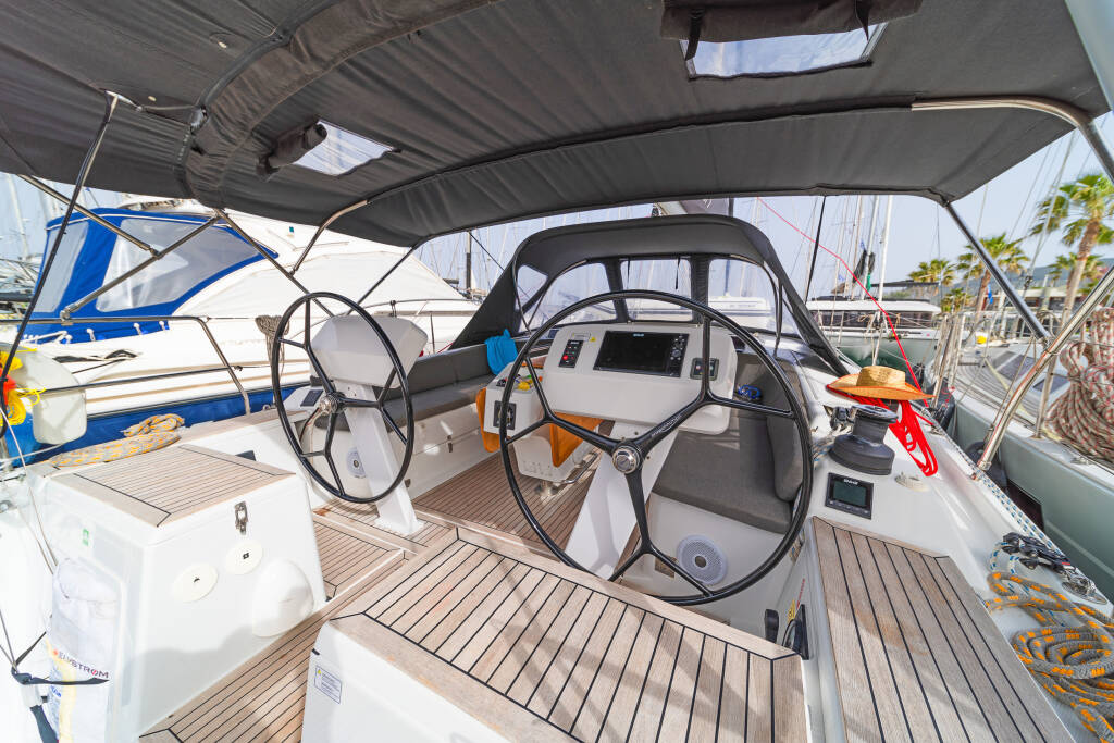 Sailing yacht Hanse 458 Ella, built in 2020 is anchored in the Kos, Kos Marina, Dodecanese, Greece. It has 3 cabins, can accommodate 6 + 2 people and has 2 toilets. Bed linen and kitchen equipment are included in the price.