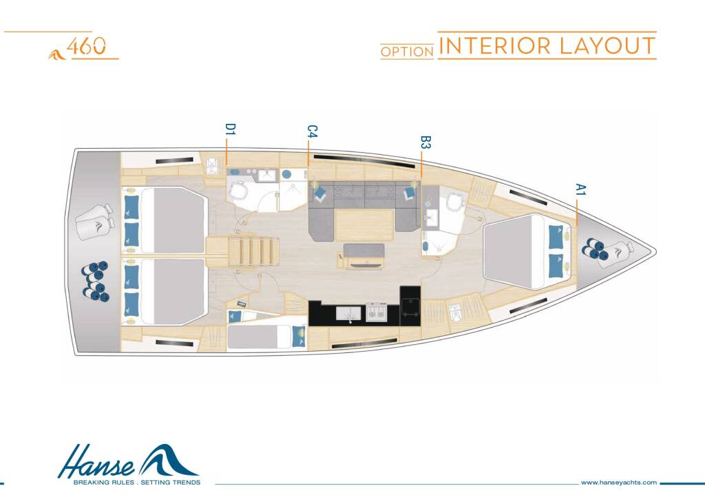 Sailing yacht Hanse 460 L'after, built in 2025 is anchored in the Marseille, Corbières Port Services, Provence-Alpes-Côte d'Azur, France. It has 4 cabins, can accommodate 8 + 2 people and has 2 toilets. Bed linen and kitchen equipment are included in the price.