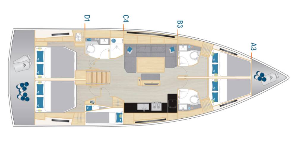 Sailing yacht Hanse 460 Yassica, built in 2022 is anchored in the Fethiye, Lykia Yacht Club, Aegean, Turkey. It has 5 cabins, can accommodate 10 people and has 3 toilets. Bed linen and kitchen equipment are included in the price.