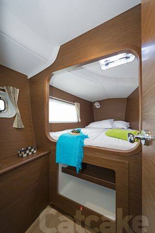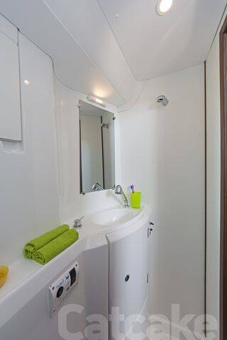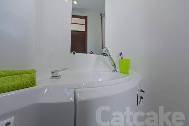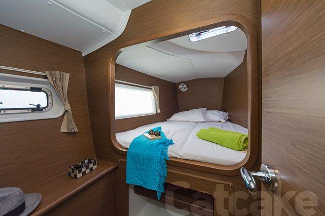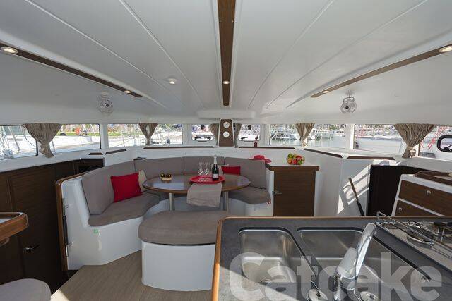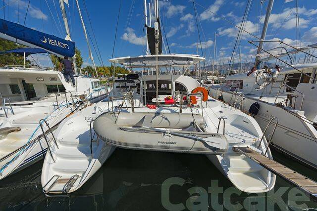 Catamaran Lagoon 380 S2 Catcake, built in 2018 is anchored in the Lefkas main port, Ionian Islands, Greece. It has 4 + 2 cabins, can accommodate 8 + 2 people and has 2 + 1 toilets. Bed linen and kitchen equipment are included in the price.