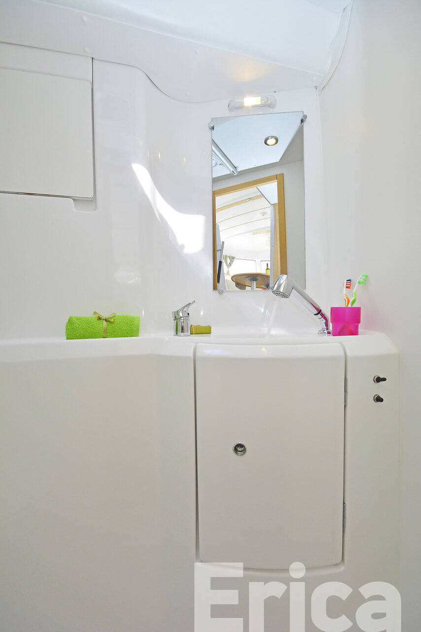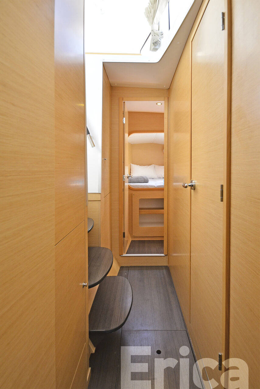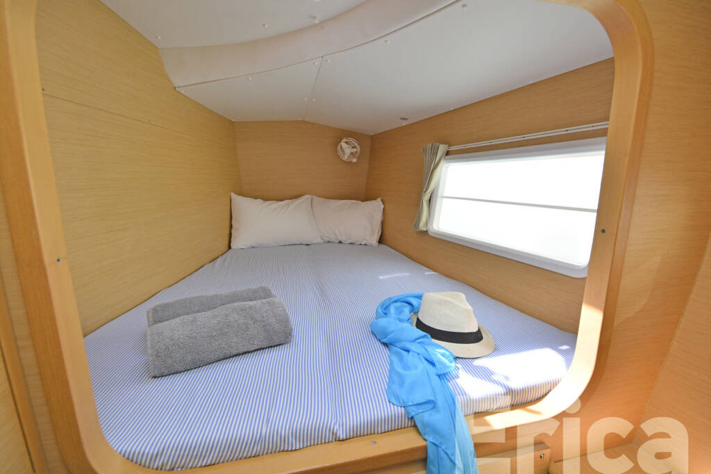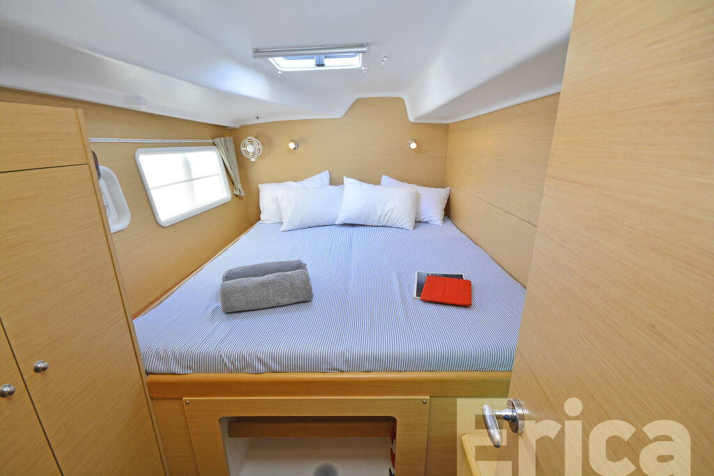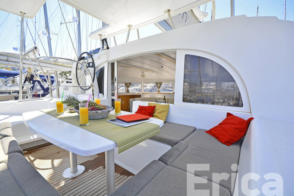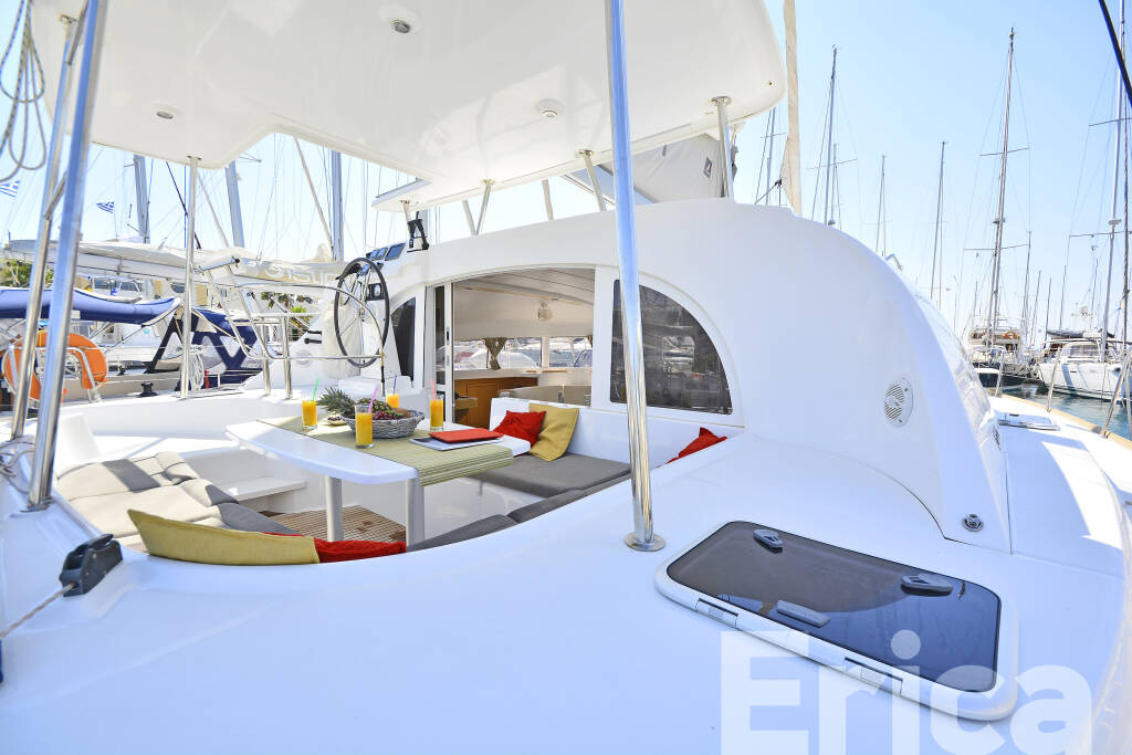 Catamaran Lagoon 380 S2 Erica, built in 2014 is anchored in the Kos, Kos Marina, Dodecanese, Greece. It has 4 + 2 cabins, can accommodate 8 + 2 people and has 2 toilets. Bed linen and kitchen equipment are included in the price.