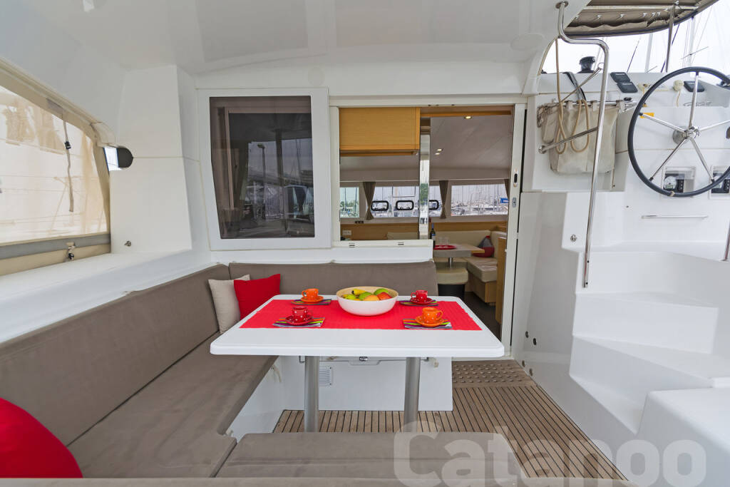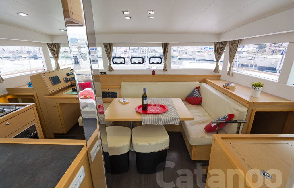 Catamaran Lagoon 39 Catanoo, built in 2014 is anchored in the Kos, Kos Marina, Dodecanese, Greece. It has 4 + 2 cabins, can accommodate 8 + 2 people and has 4 toilets. Bed linen and kitchen equipment are included in the price.