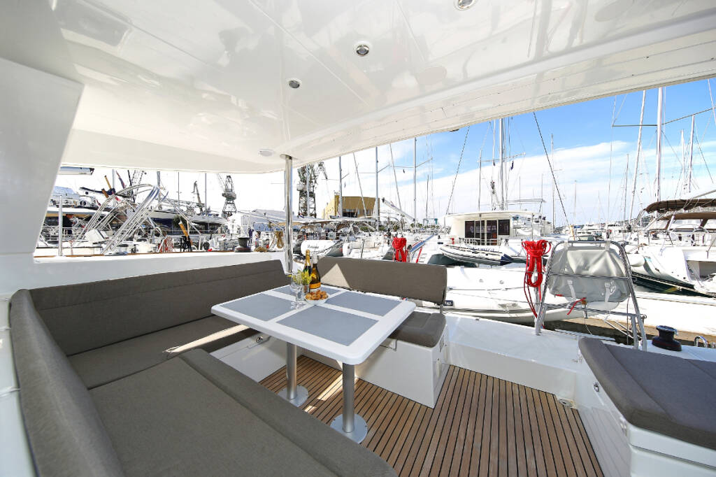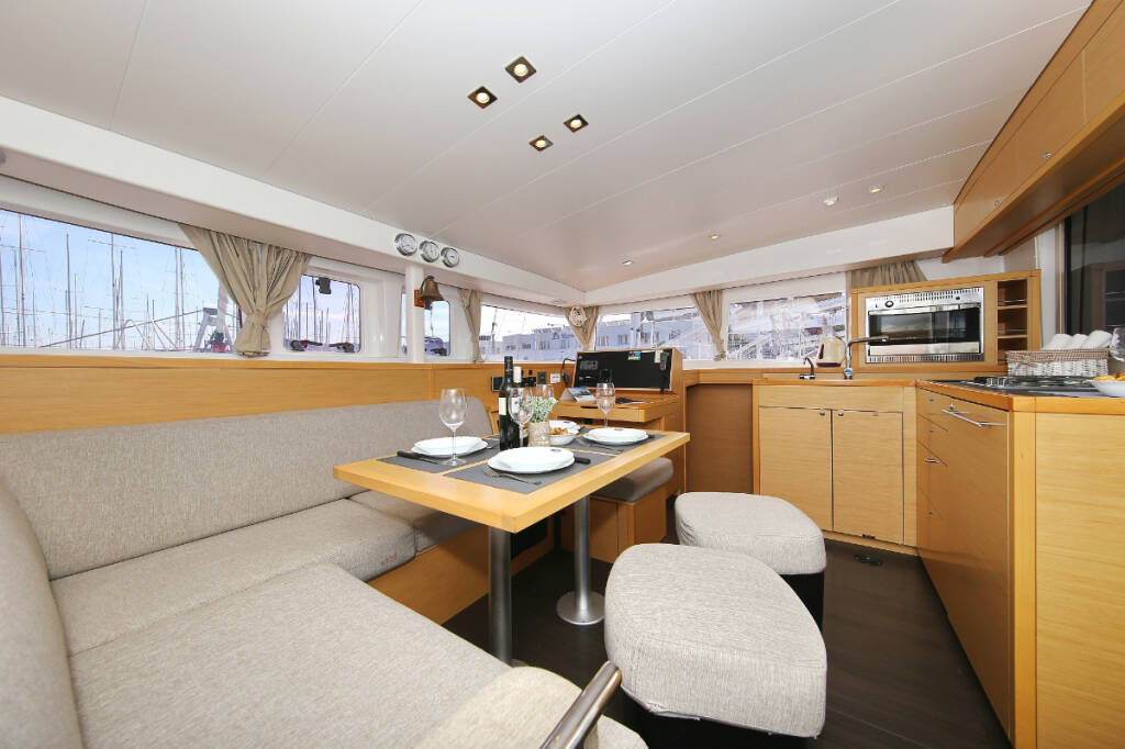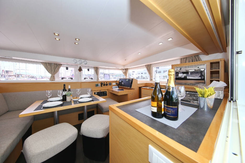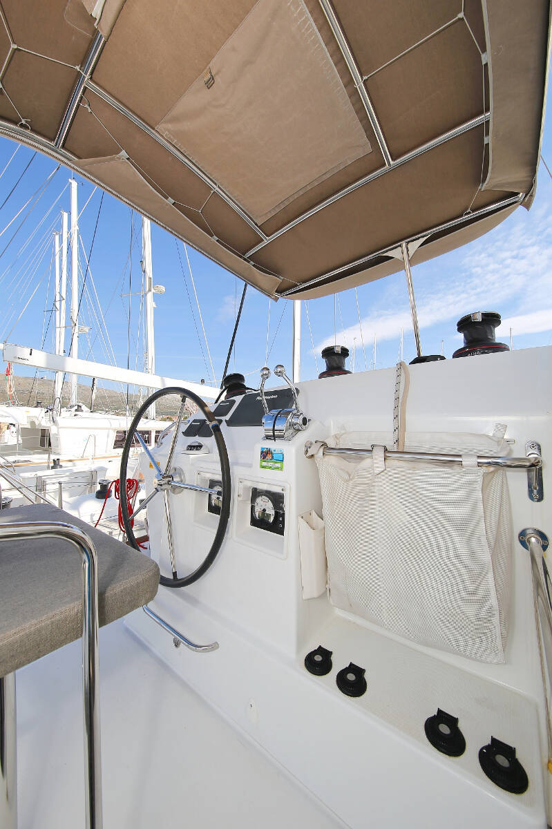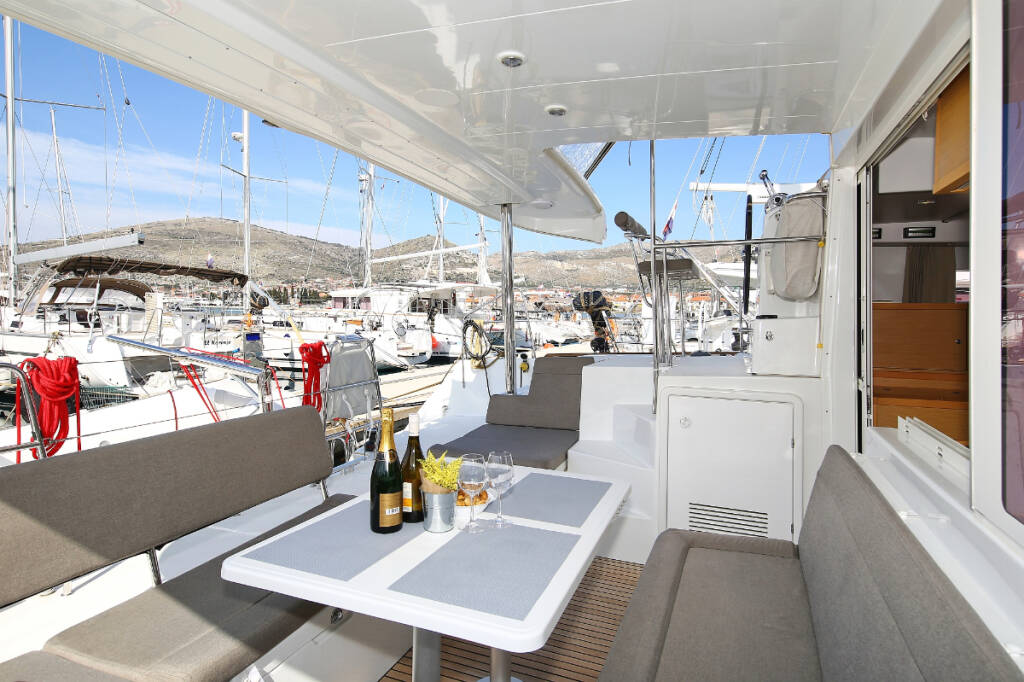 Catamaran Lagoon 400 S2 Elea, built in 2014 is anchored in the ACI Marina Trogir, Split region, Croatia. It has 4 + 2 cabins, can accommodate 8 + 2 + 2 people and has 2 toilets. Bed linen and kitchen equipment are included in the price.
