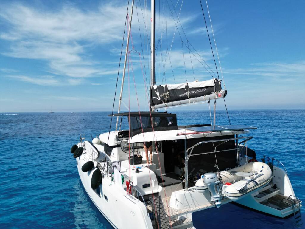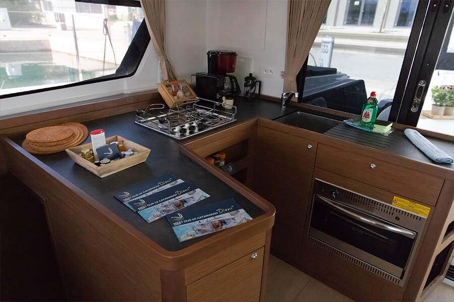 Catamaran Lagoon 42 Dioni, built in 2019 is anchored in the Preveza, Main Port, Ionian Islands, Greece. It has 4 + 2 cabins, can accommodate 8 + 2 people and has 5 toilets. Bed linen and kitchen equipment are included in the price.